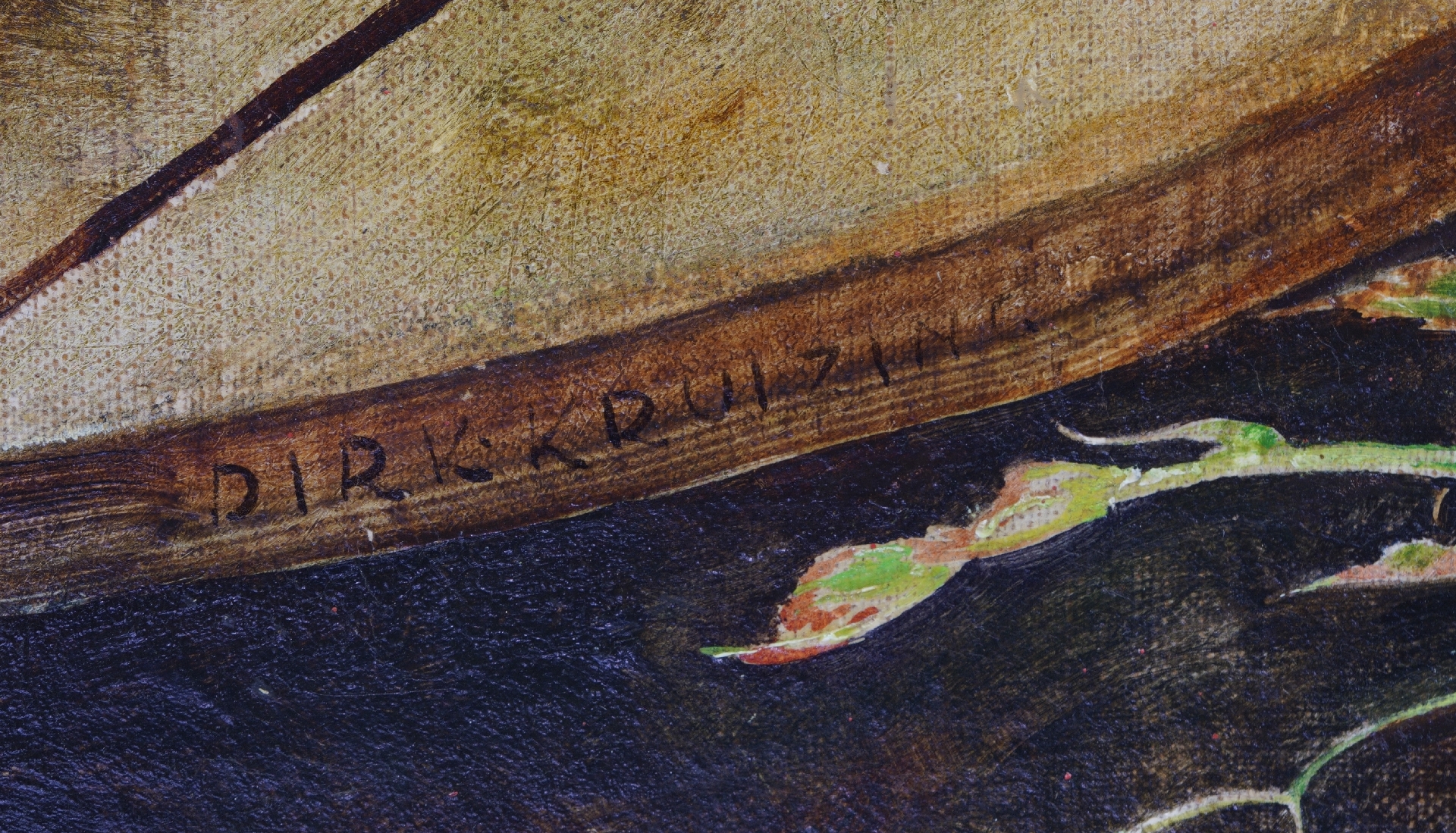 Dirk Kruizinga wurde für seine Zeichnungen und Aquarelle ebenso berühmt wie für seine Malerei. Auf Reisen in Frankreich und Italien fertigte er Aquarelle an, vor allem Landschaften, Stadtansichten und Stillleben. Sie unterscheiden sich von seinen Ölgemälden, die manchmal stark anekdotisch sind und einen Stil haben, der mit der alten flämischen Malerei wie der von Pieter Breughel und seiner Umgebung verwandt ist. Kruizinga kopierte die Realität nicht, sondern komponierte sie mit seiner eigenen Fantasie, indem er realistische und erfundene Details kombinierte. Seine Palette ist zurückhaltend, nüchtern. In seiner Heimatstadt Amsterdam war er einer der Gründer von De Brug, der realistische Maler vereinte.