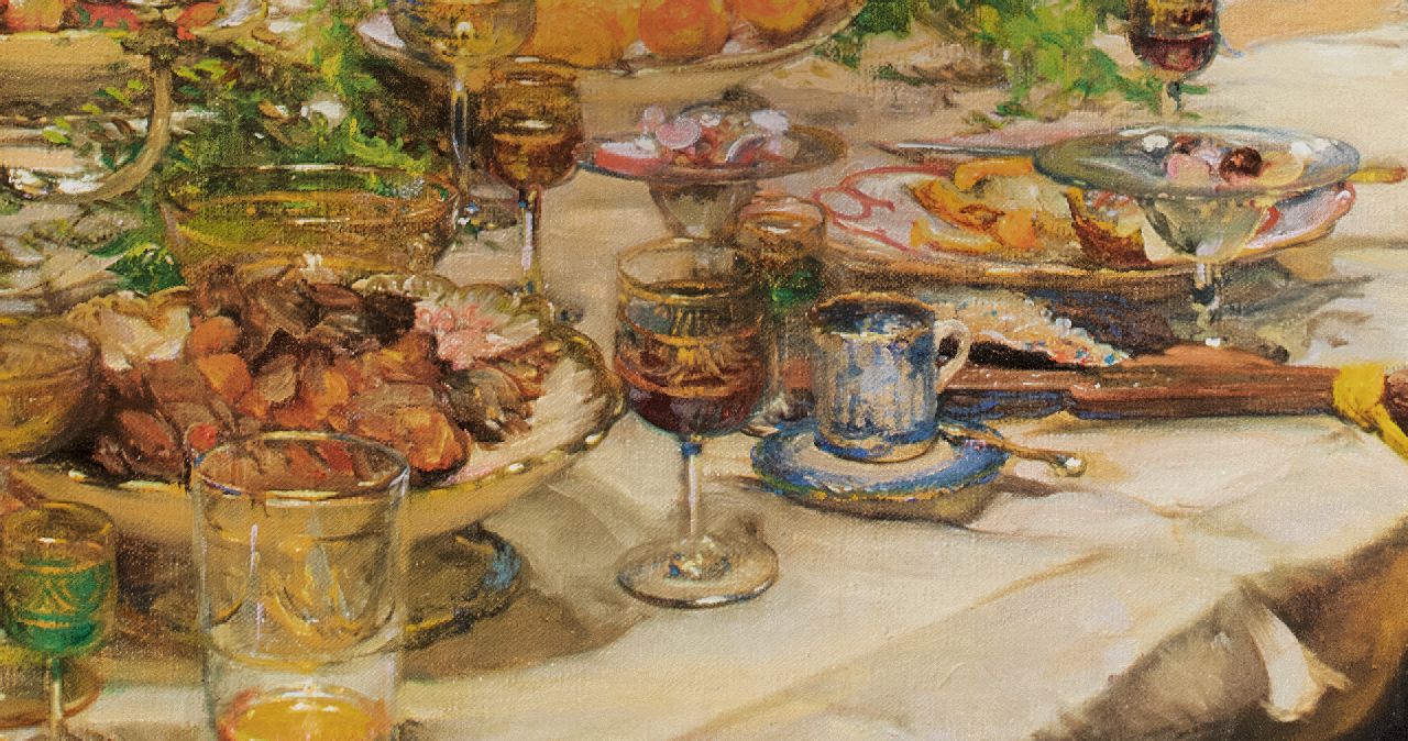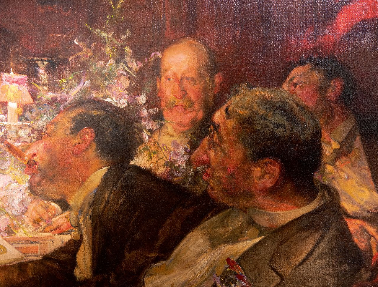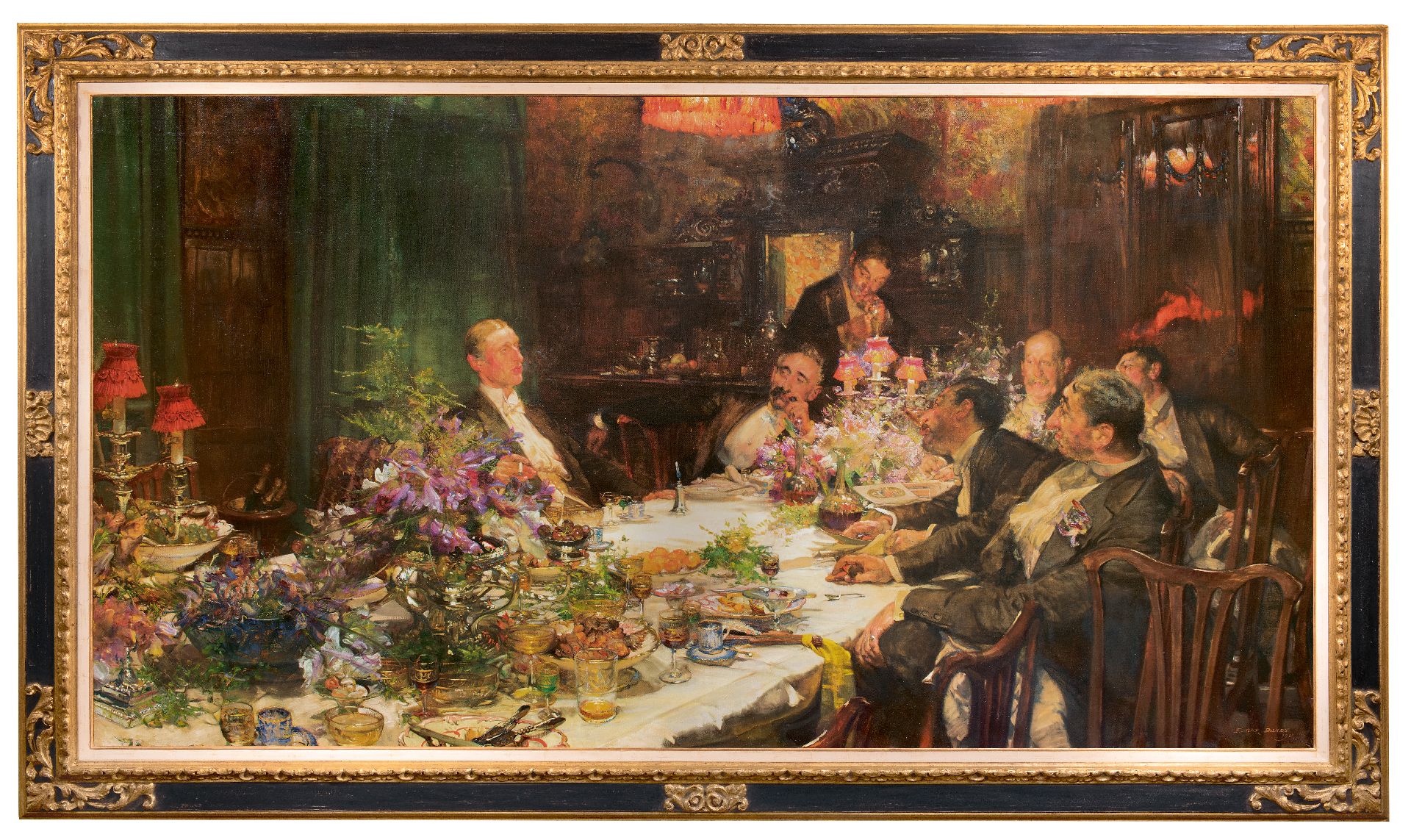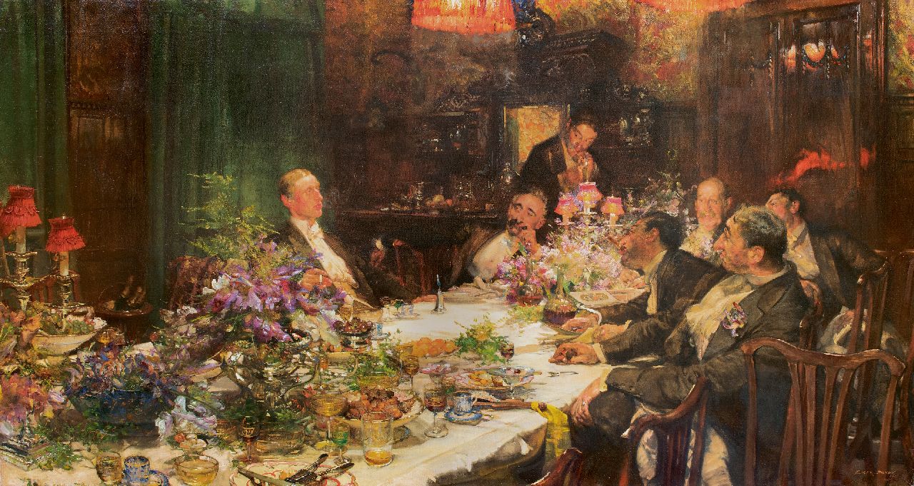 'A problem painting' Während der Ausstellung 1913 in der Londoner Royal Academy wurden drei Gemälde ausgestellt, die aktuelle soziale oder politische Themen behandelten und als 'problem paintings' galten. Zu einer Zeit, als die Boulevardpresse ein Publikum ansprach das nach Melodramen und politischen Skandalen lechzte, hatten Künstler viel zu erzählen. Eines der drei Gemälde in der Ausstellung war Edward Bundys 'Finanzen', inspiriert von der Marconi-Affäre. 1912 handelte die britische Admiralität einen Vertrag mit der Marconi Company über die Installation eines drahtlosen Kommunikationssystems aus. Ganz England war von dem darauffolgenden politischen und finanziellen Skandal fasziniert. Die jüdische Familie Isaacs, Direktoren der Marconi Company, wurde der Vetternwirtschaft beschuldigt, und drei Minister wurden wegen illegaler Aktienspekulation angeklagt. Im Frühjahr 1913 sagten Zeugen im Unterhaus aus, und ein Bericht wurde veröffentlicht und debattiert. Im Juni wurden die drei Minister freigesprochen, und im Juli wurde ein neuer Vertrag unterzeichnet. Genau in dieser Zeit erregte Bundys 'Finance', in der Presse als 'Ein edwardianisches Problembild kombiniert mit einem opulenten Stillleben' beschrieben, während der Ausstellung der Royal Academy große Aufmerksamkeit. Das 'Problembild' bot den Betrachtern eine wunderbare Gelegenheit, ihre Meinung zum Skandal zu äußern. Die Szene mit kraftvoll dargestellten, fast karikaturhaften Figuren, die nach einem üppigen Mahl in eine hitzige Diskussion verwickelt sind, zeigt eine klassische Bundy-Konstruktion. Sie bietet eine Momentaufnahme eines Aspekts einer Aktivität und lässt den Betrachter gleichzeitig erkennen, dass im Hintergrund viel mehr passiert. Nach einer zweiten Ausstellung in der Royal Academy im Jahr 1916 wurde das Gemälde von William Lever erworben, Mitbegründer der Lever Brothers, dem Vorläufer von Unilever in Großbritannien. 1970 gelangte das Werk in den Besitz der Sammler John und Johanna Bass, New York, und 1979 wurde es vom Bass Museum of Art, Miami Beach, erworben.