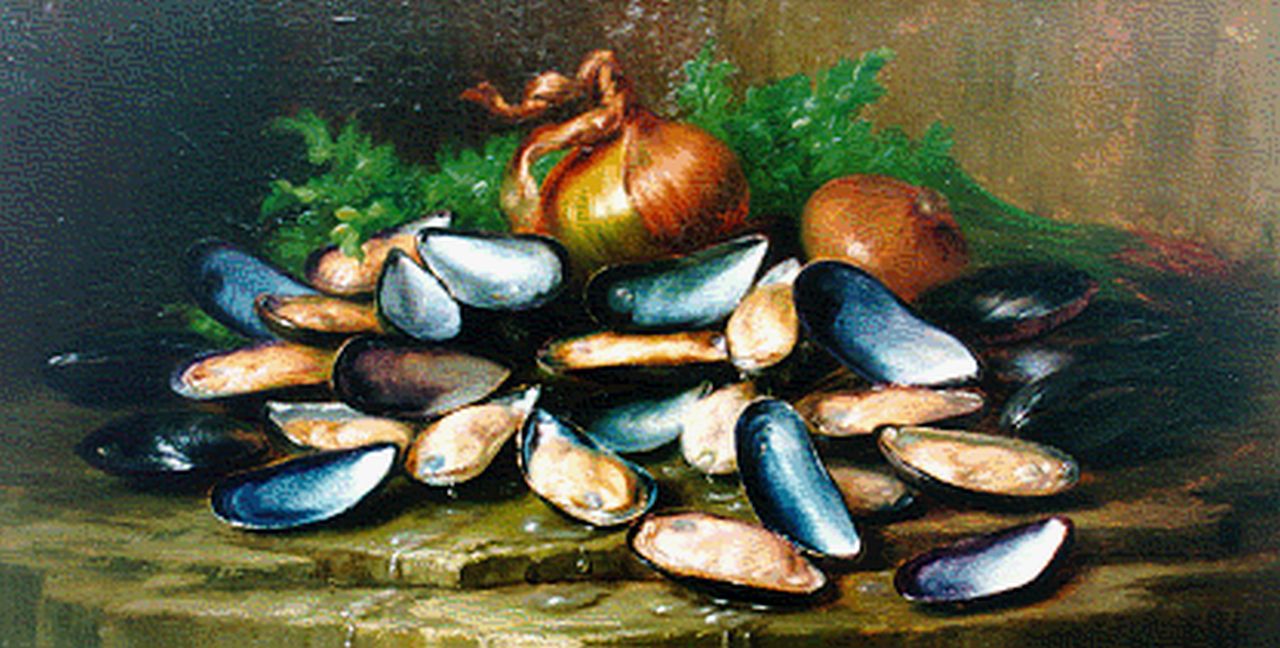 Edward van Ryswyck Kunstwerk • Gemälde • zuvor zu verkaufen A still life with mussels and onions