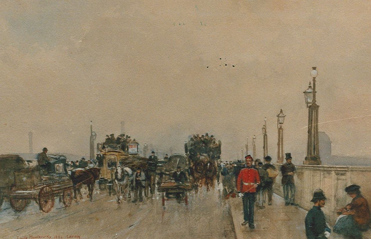 Emile Hoeterickx Kunstwerk • Aquarell • Zeichnung • zuvor zu verkaufen Horsetrams, Waterloo Bridge