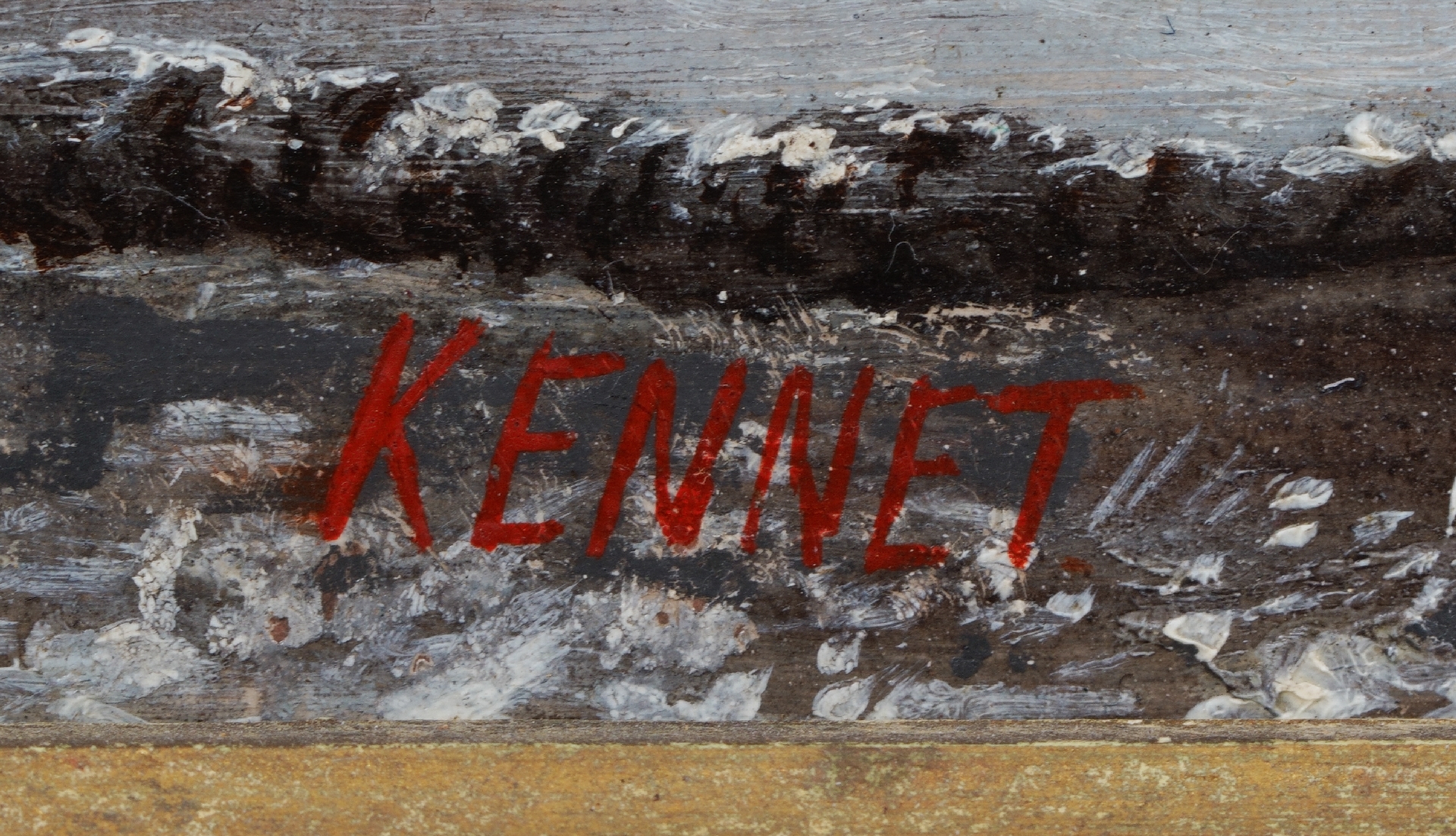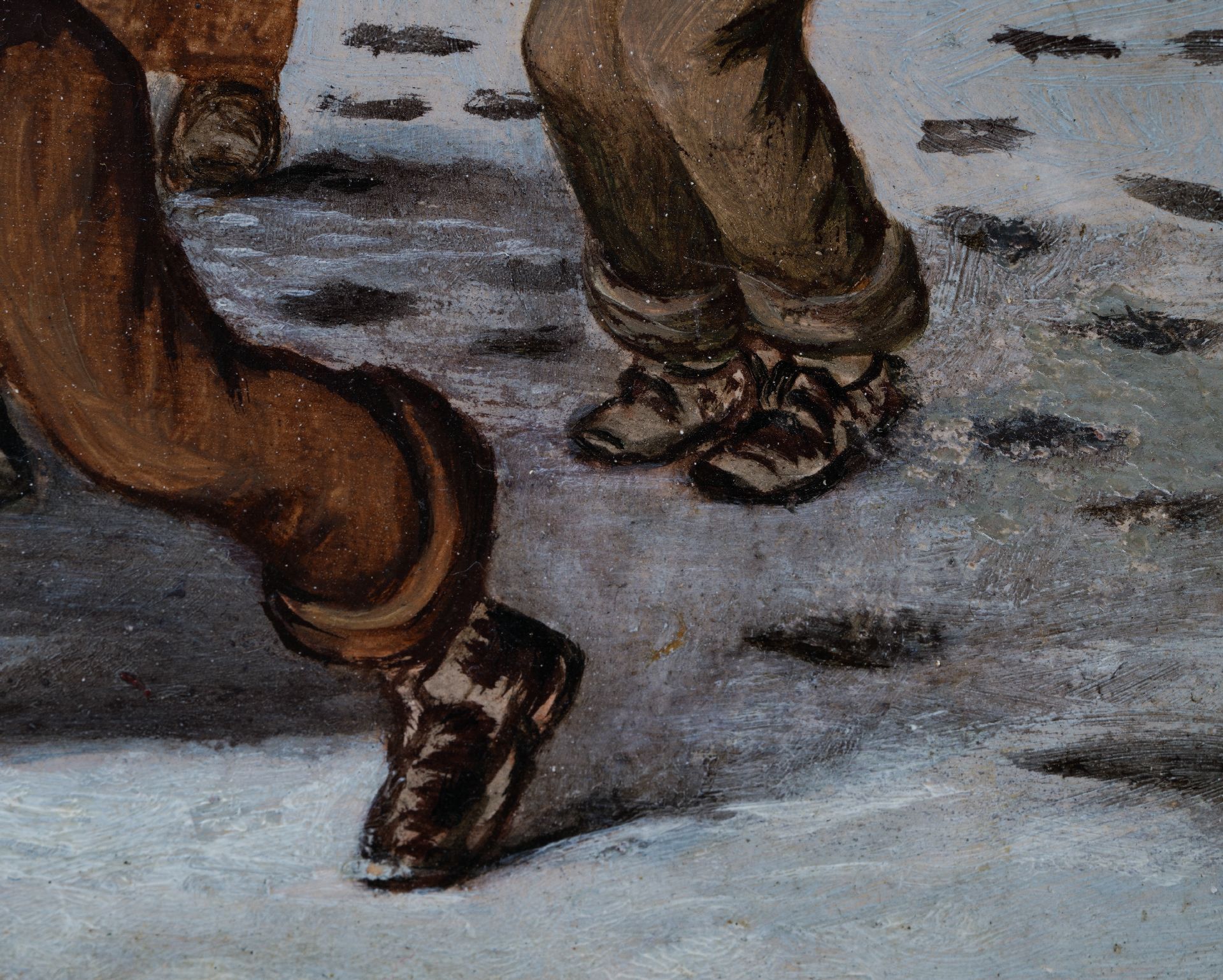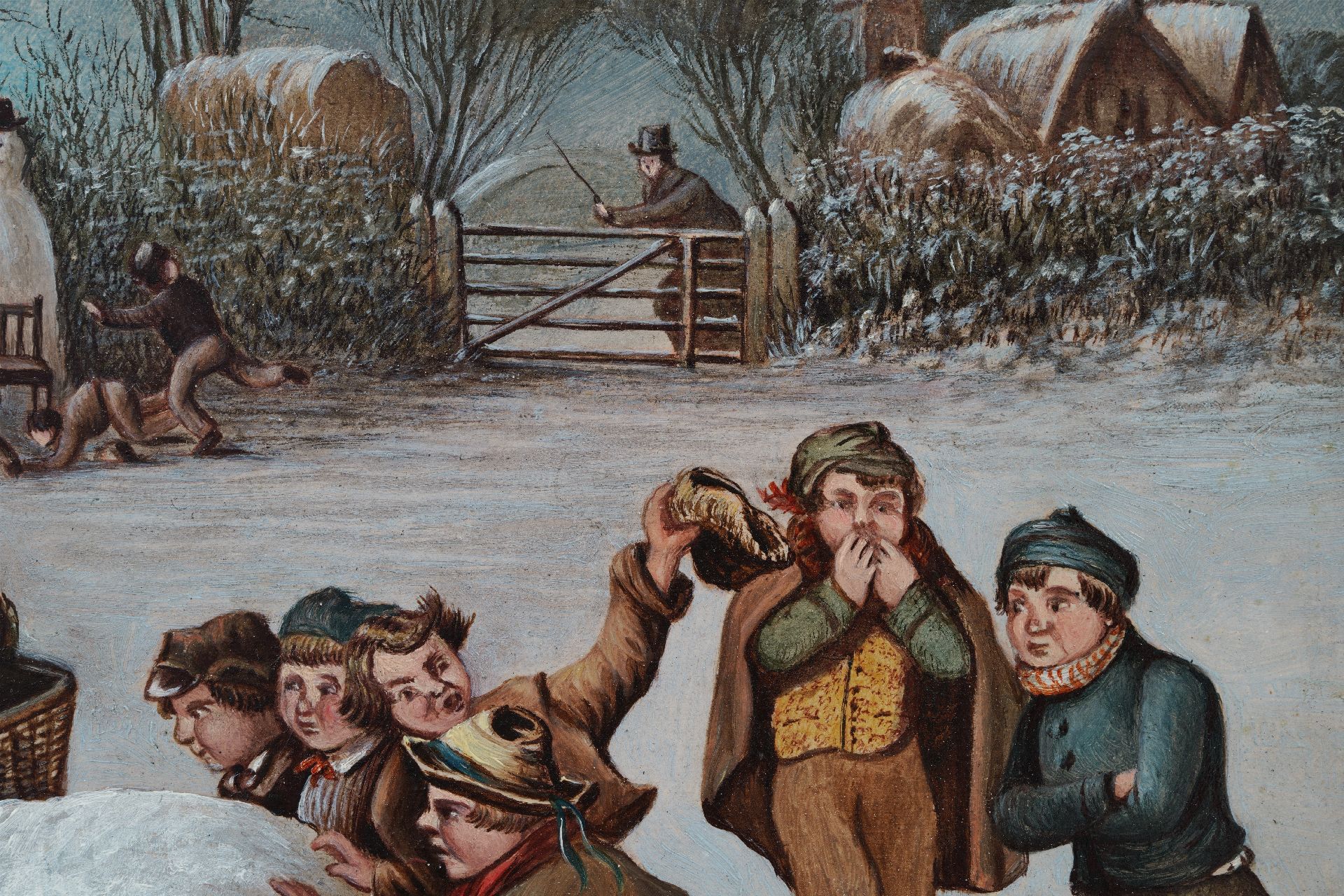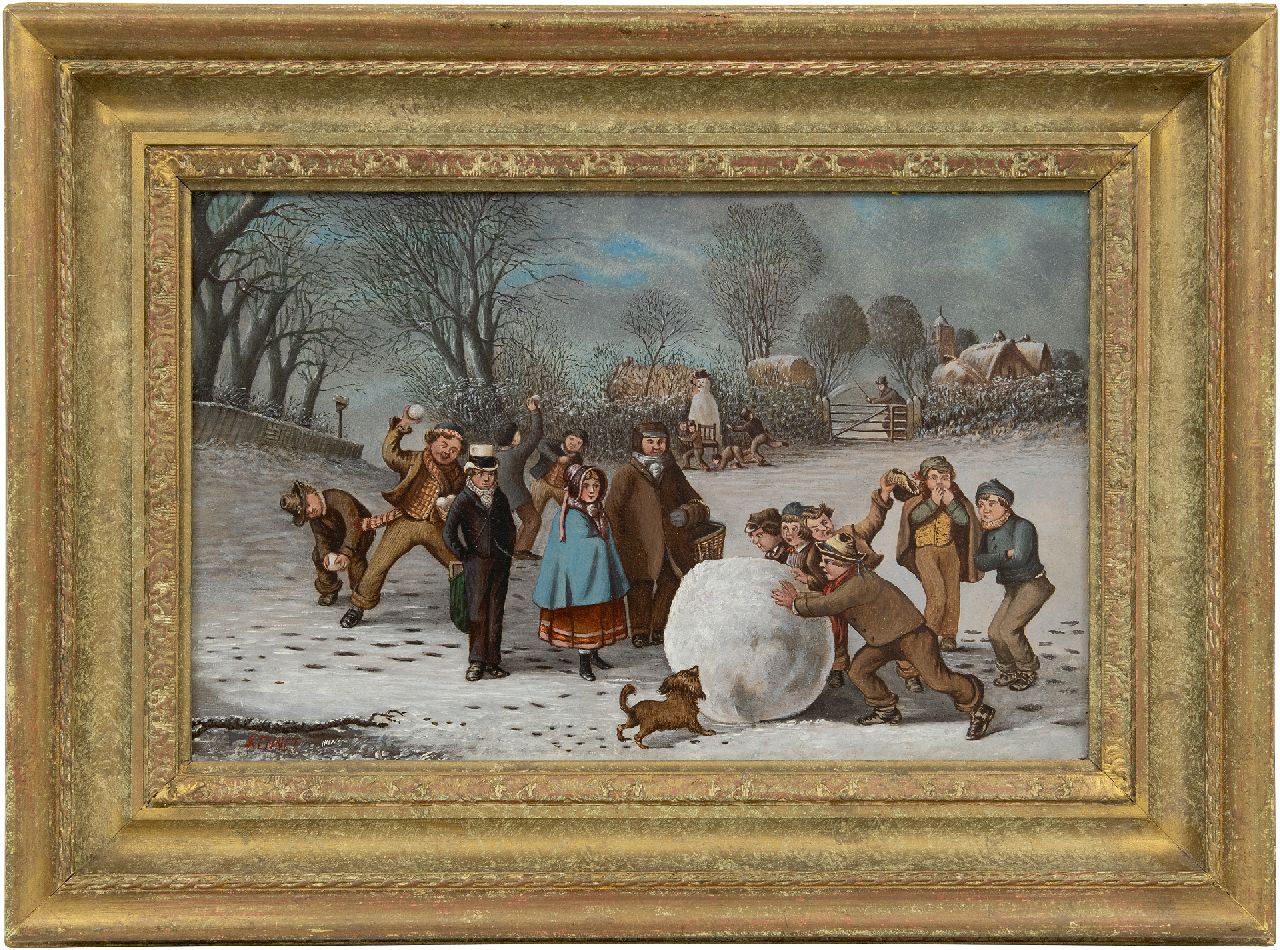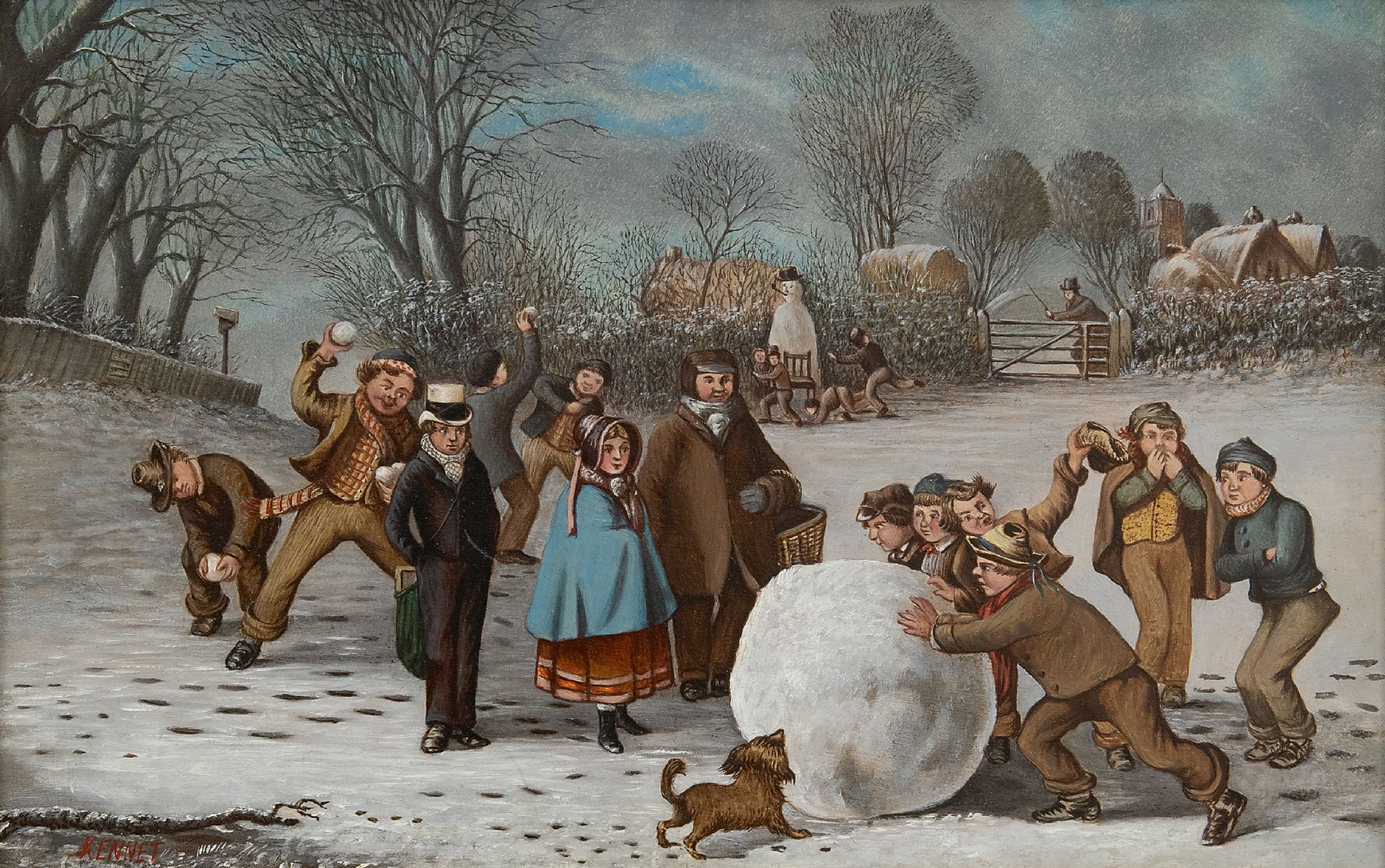 Der unbekannte englische Meister 'Kennet'muss sich bei der Anfertigung dieses Gemäldes Ende des 19. Jahrhunderts mit dem Werk des bekannten Genremalers William Hemsley (1817/1819-1906) befasst haben. Als Sohn eines Architekten war Hemsley dazu bestimmt, den beruflichen Weg seines Vaters zu gehen, aber sein künstlerisches Interesse zeigte sich früh und er brachte sich das Malen in seiner Freizeit selbst bei. Die Themenwahl seiner Arbeiten zeigt seine Liebe zu den alltäglichen Dingen des Lebens, bevorzugt zu Kindern. 'Kennet' malte eine Winterlandschaft mit Kindern, die den winterlichen Schneefall genießen. Manche Kinder rollen einen riesigen Schneeball vorwärts, manche freuen sich heimlich über die Schneeballattacke, die sie für die Eltern vor sich haben oder blasen sich die Hände vor Kälte warm, wieder andere tanzen im Hintergrund um einen großen Schneemann. All diese Elemente bildeten das Rezept für eine damals attraktive und beliebte Aufführung. Und sie sollten in dieser Zeit sein, in der eine gute Schneedecke, die für tiefes Wintervergnügen notwendig ist, immer seltener wird.