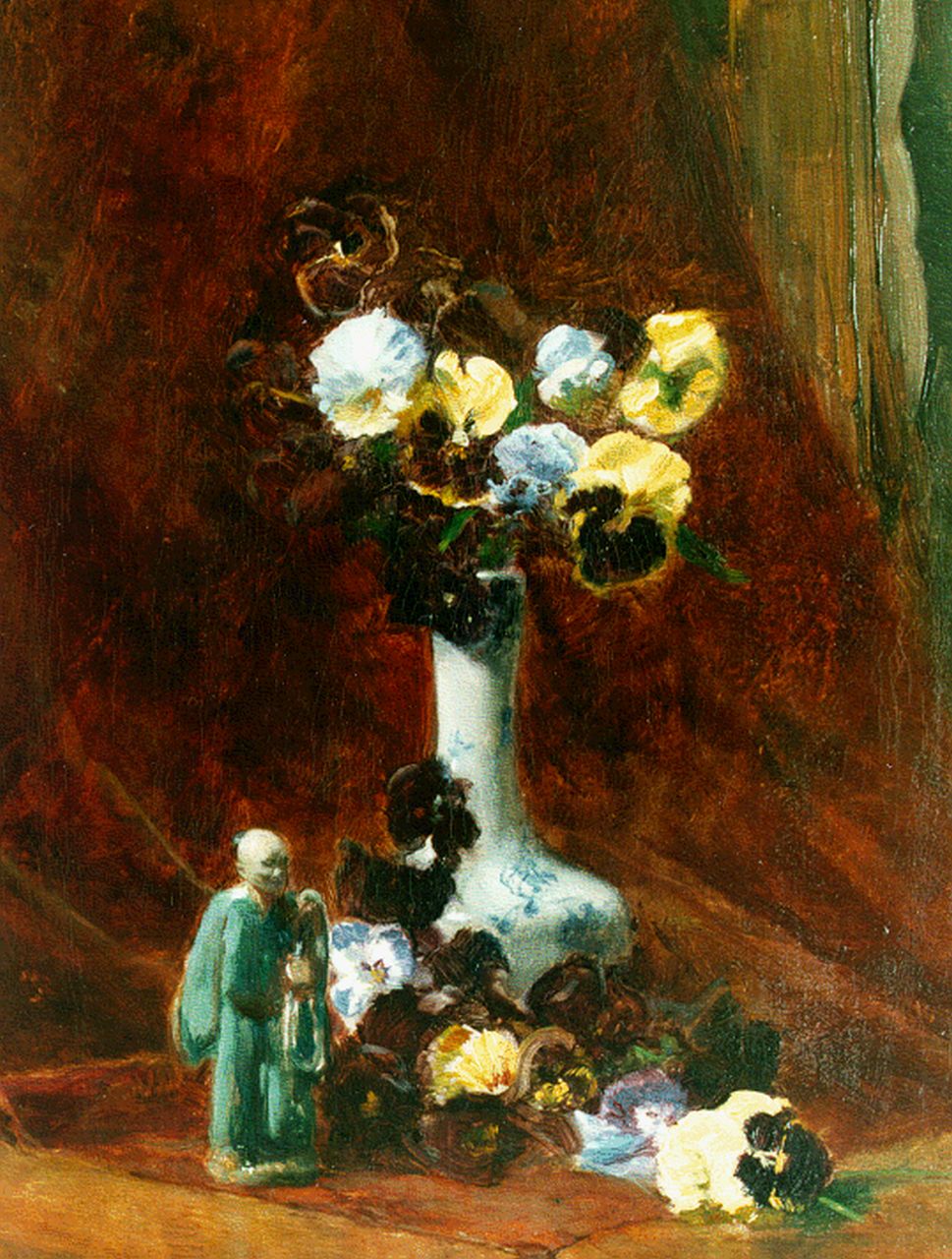 A still life with violets and a Japanese statue
