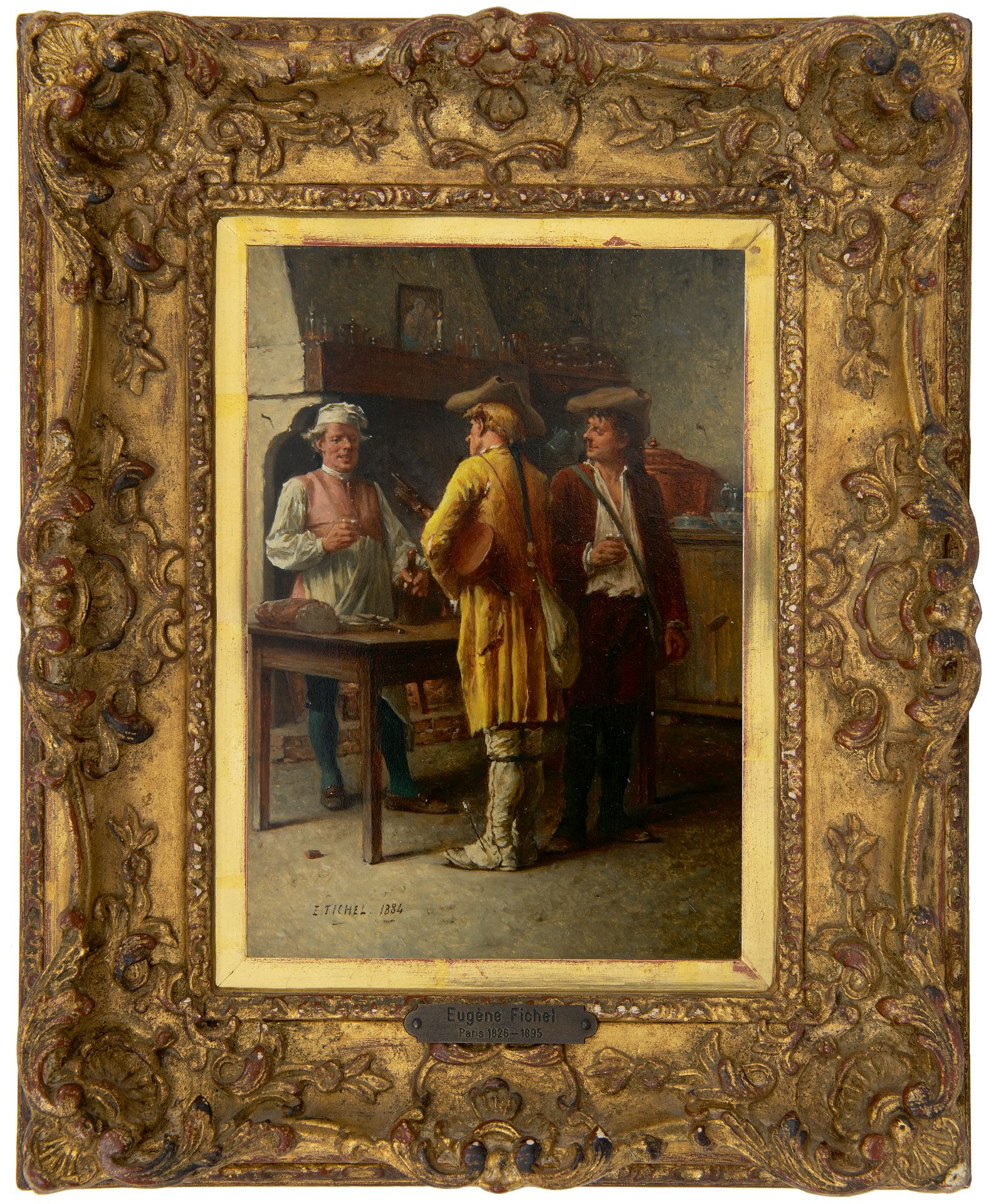 Eugène Fichel gehört zu den französischen Malern, deren Genredarstellungen der vorherrschenden Popularität des 18. Jahrhunderts folgten. Ernest Meissonnier war darin sein großes Vorbild, aber Fichel hatte schon früh seine eigene Gruppe von Bewunderern. Besonders geschätzt wurden seine raffinierte Maltechnik, korrekte historische Details und der subtile Humor, der in seinen Gemälden eine Rolle spielt. Der Maler lebte und arbeitete sein ganzes Leben in Paris, wo er seine Ausbildung an der École des Beaux-Arts erhielt. Neben Genrebildern, die er oft mit aussagekräftigen Titeln versah, malte er historische Szenen und einige Porträts.