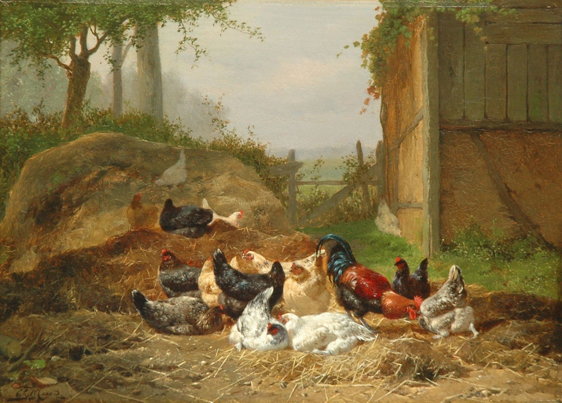 Eugène Remy Maes Kunstwerk • Gemälde • zuvor zu verkaufen Poultry in a sunlit farmyard