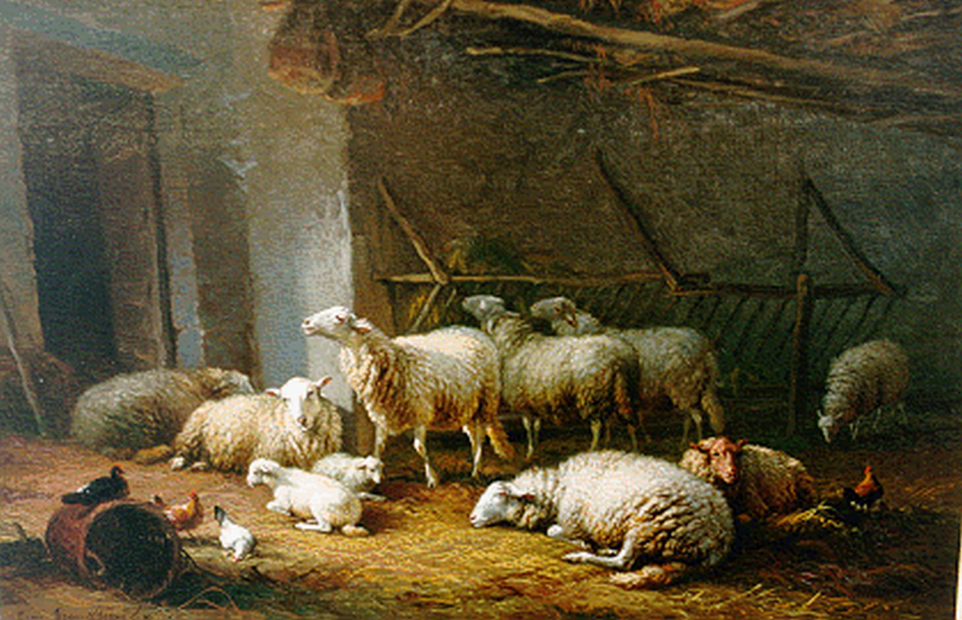Eugène Verboeckhoven Kunstwerk • Gemälde • zuvor zu verkaufen Poultry and sheep in a stable