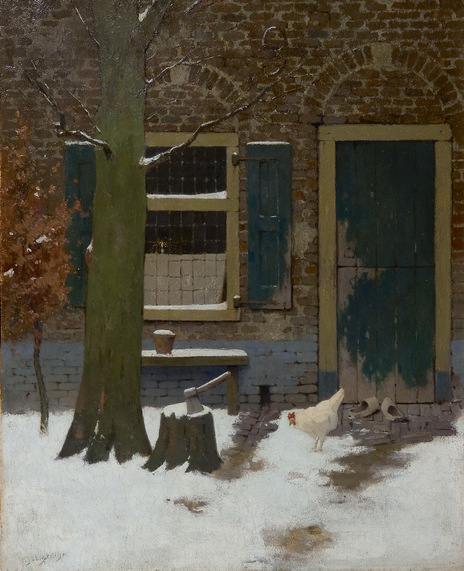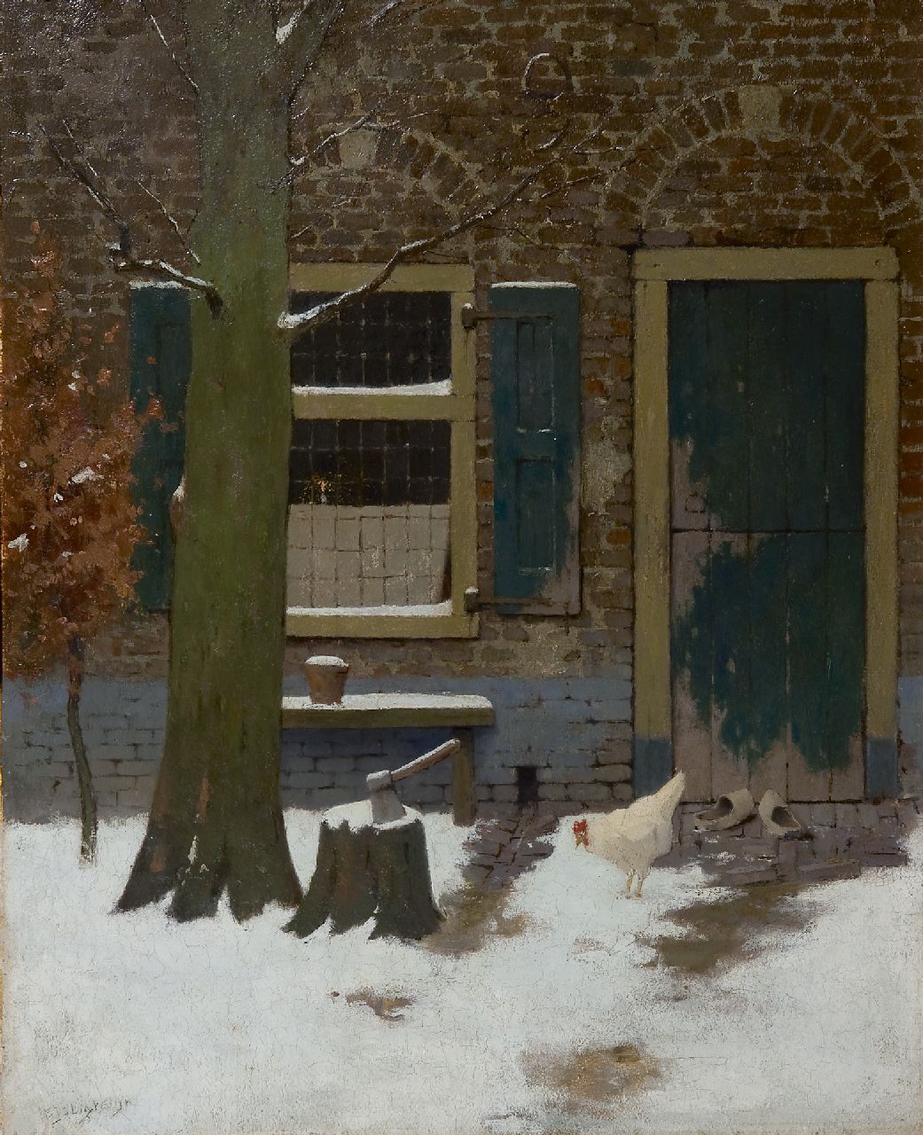Evert Jan Ligtelijn Kunstwerk • Gemälde • zuvor zu verkaufen Ein schneebedeckter Hof mit einem Huhn
