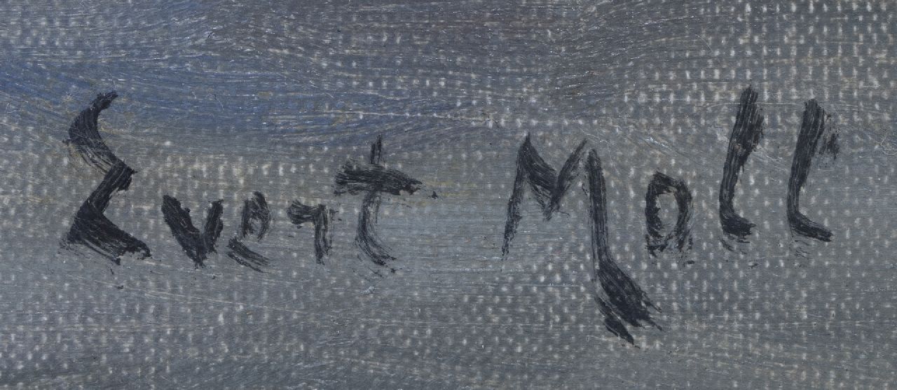 Evert Moll wurde am bekanntesten für seine Porträts des Rotterdamer Hafens und der Schifffahrt auf der Nieuwe Maas, die er in den 1920er und 30er Jahren des letzten Jahrhunderts malte. Evert Moll begann um 1900 als Anhänger der Haager Schule und wechselte bald sein Arbeitsgebiet zu den Kais und Brücken des Maasstad. Die Dynamik des Hafengeschäfts war auch eine Inspirationsquelle für den Maler. Darüber hinaus hat er sich in vielen anderen Genres hervorgetan. Er malte auch Stadtlandschaften, Landschaften und farbenfrohe, gewagte Blumenstillleben. Evert Moll war Autodidakt, erhielt jedoch Ratschläge von Willem Maris und Willem Roelofs.