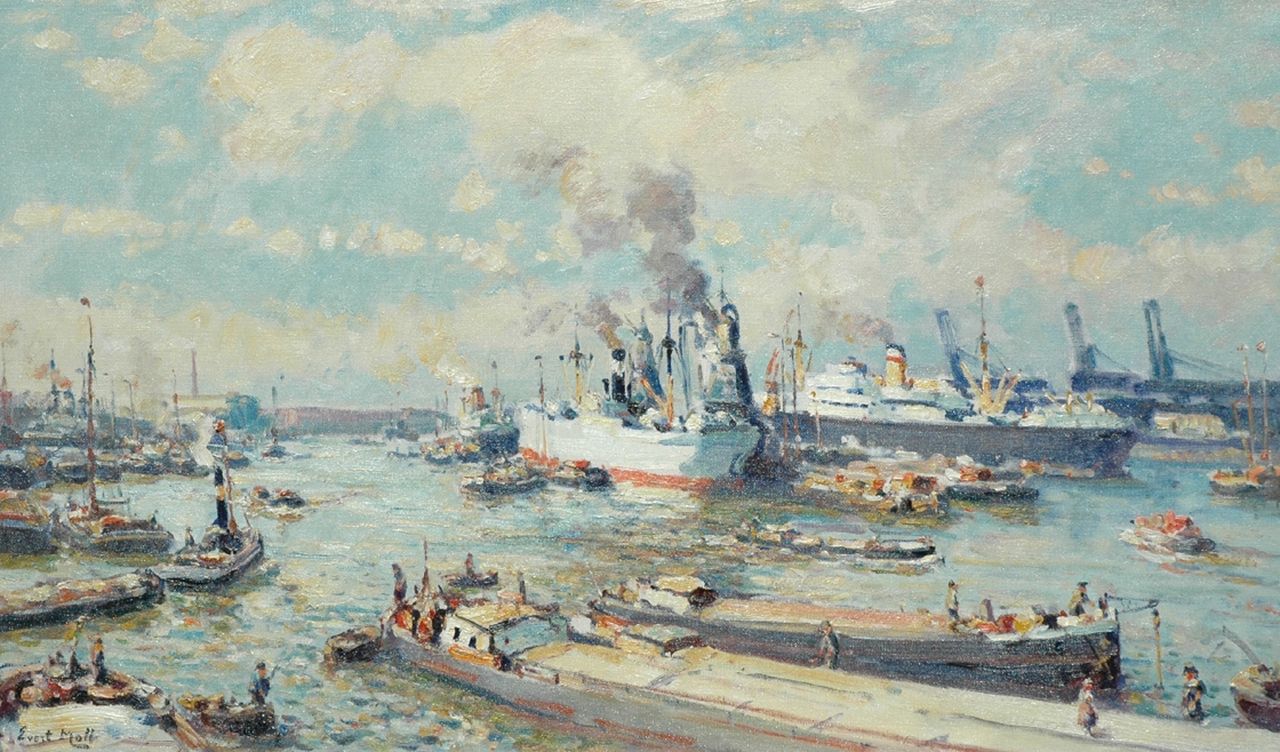 Evert Moll Kunstwerk • Gemälde • zuvor zu verkaufen A harbour view, Rotterdam