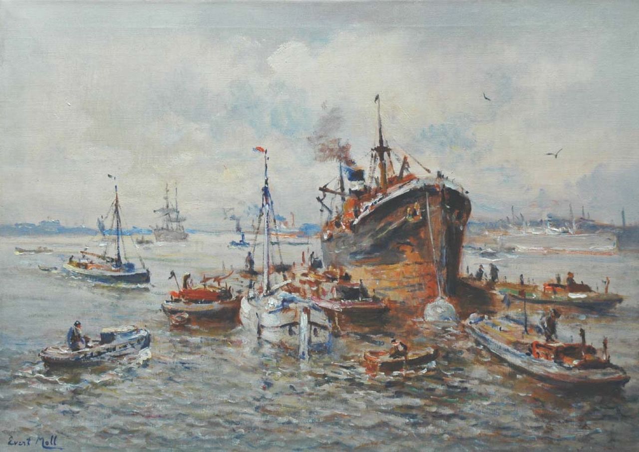 Evert Moll wurde am bekanntesten für seine Porträts des Rotterdamer Hafens und der Schifffahrt auf der Nieuwe Maas, die er in den 1920er und 30er Jahren des letzten Jahrhunderts malte. Evert Moll begann um 1900 als Anhänger der Haager Schule und wechselte bald sein Arbeitsgebiet zu den Kais und Brücken des Maasstad. Die Dynamik des Hafengeschäfts war auch eine Inspirationsquelle für den Maler. Darüber hinaus hat er sich in vielen anderen Genres hervorgetan. Er malte auch Stadtlandschaften, Landschaften und farbenfrohe, gewagte Blumenstillleben. Evert Moll war Autodidakt, erhielt jedoch Ratschläge von Willem Maris und Willem Roelofs.