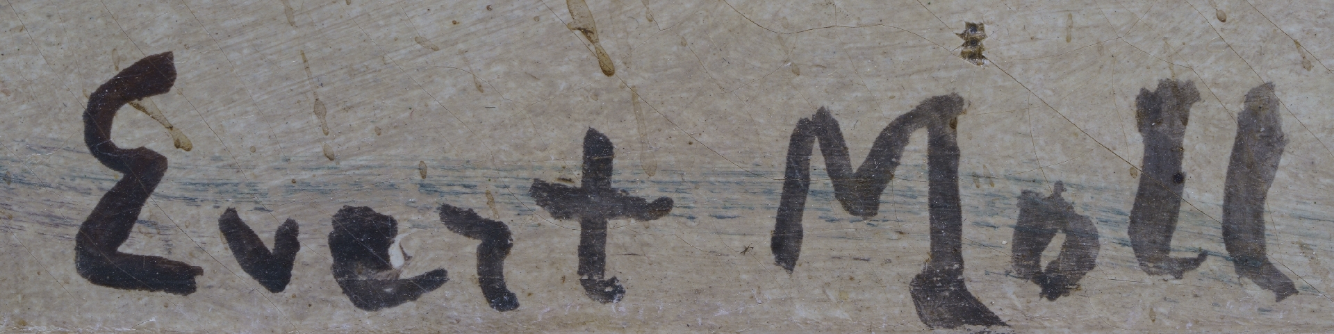 Evert Moll wurde am bekanntesten für seine Porträts des Rotterdamer Hafens und der Schifffahrt auf der Nieuwe Maas, die er in den 1920er und 30er Jahren des letzten Jahrhunderts malte. Evert Moll begann um 1900 als Anhänger der Haager Schule und wechselte bald sein Arbeitsgebiet zu den Kais und Brücken des Maasstad. Die Dynamik des Hafengeschäfts war auch eine Inspirationsquelle für den Maler. Darüber hinaus hat er sich in vielen anderen Genres hervorgetan. Er malte auch Stadtlandschaften, Landschaften und farbenfrohe, gewagte Blumenstillleben. Evert Moll war Autodidakt, erhielt jedoch Ratschläge von Willem Maris und Willem Roelofs.