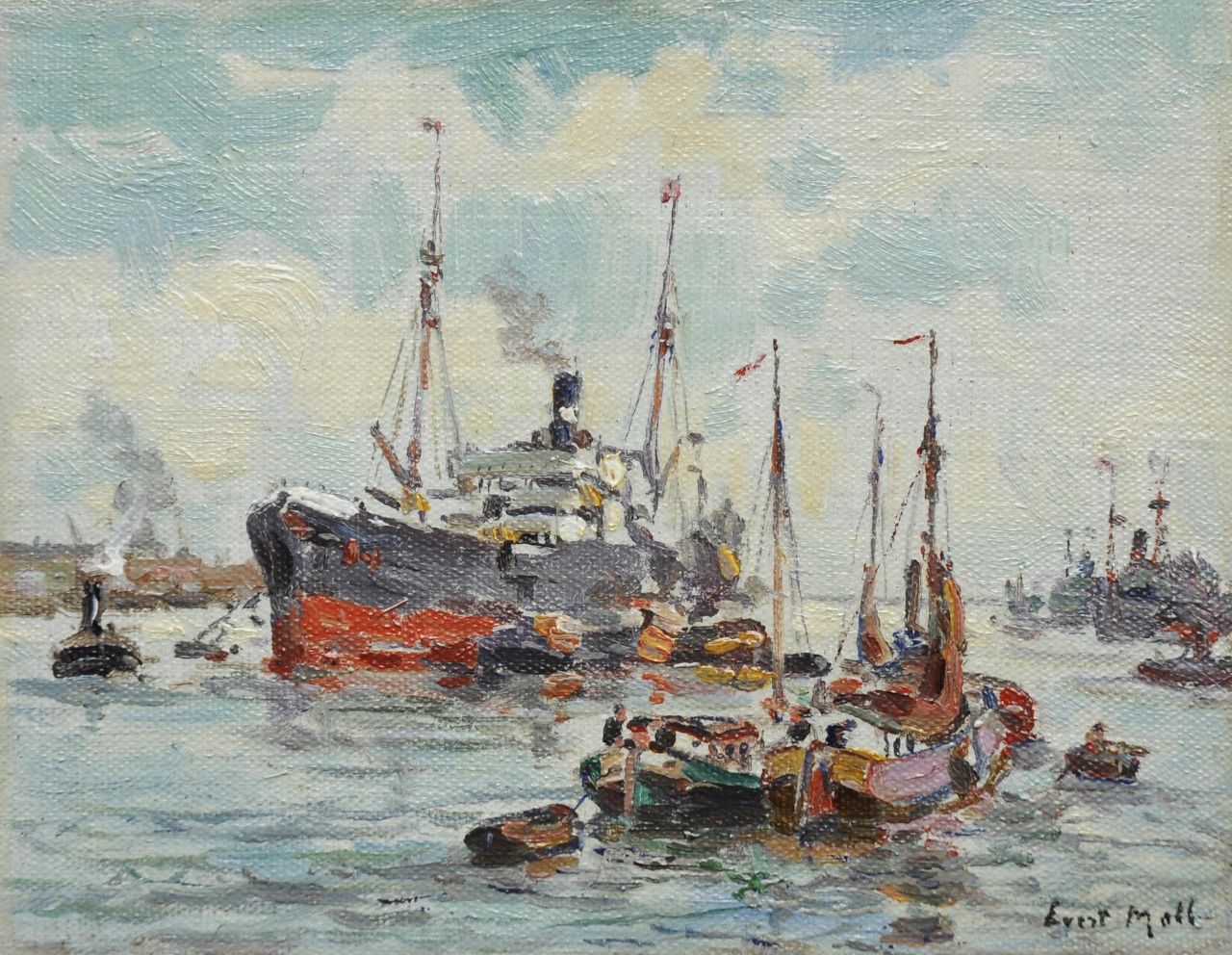 Evert Moll wurde am bekanntesten für seine Porträts des Rotterdamer Hafens und der Schifffahrt auf der Nieuwe Maas, die er in den 1920er und 30er Jahren des letzten Jahrhunderts malte. Evert Moll begann um 1900 als Anhänger der Haager Schule und wechselte bald sein Arbeitsgebiet zu den Kais und Brücken des Maasstad. Die Dynamik des Hafengeschäfts war auch eine Inspirationsquelle für den Maler. Darüber hinaus hat er sich in vielen anderen Genres hervorgetan. Er malte auch Stadtlandschaften, Landschaften und farbenfrohe, gewagte Blumenstillleben. Evert Moll war Autodidakt, erhielt jedoch Ratschläge von Willem Maris und Willem Roelofs.