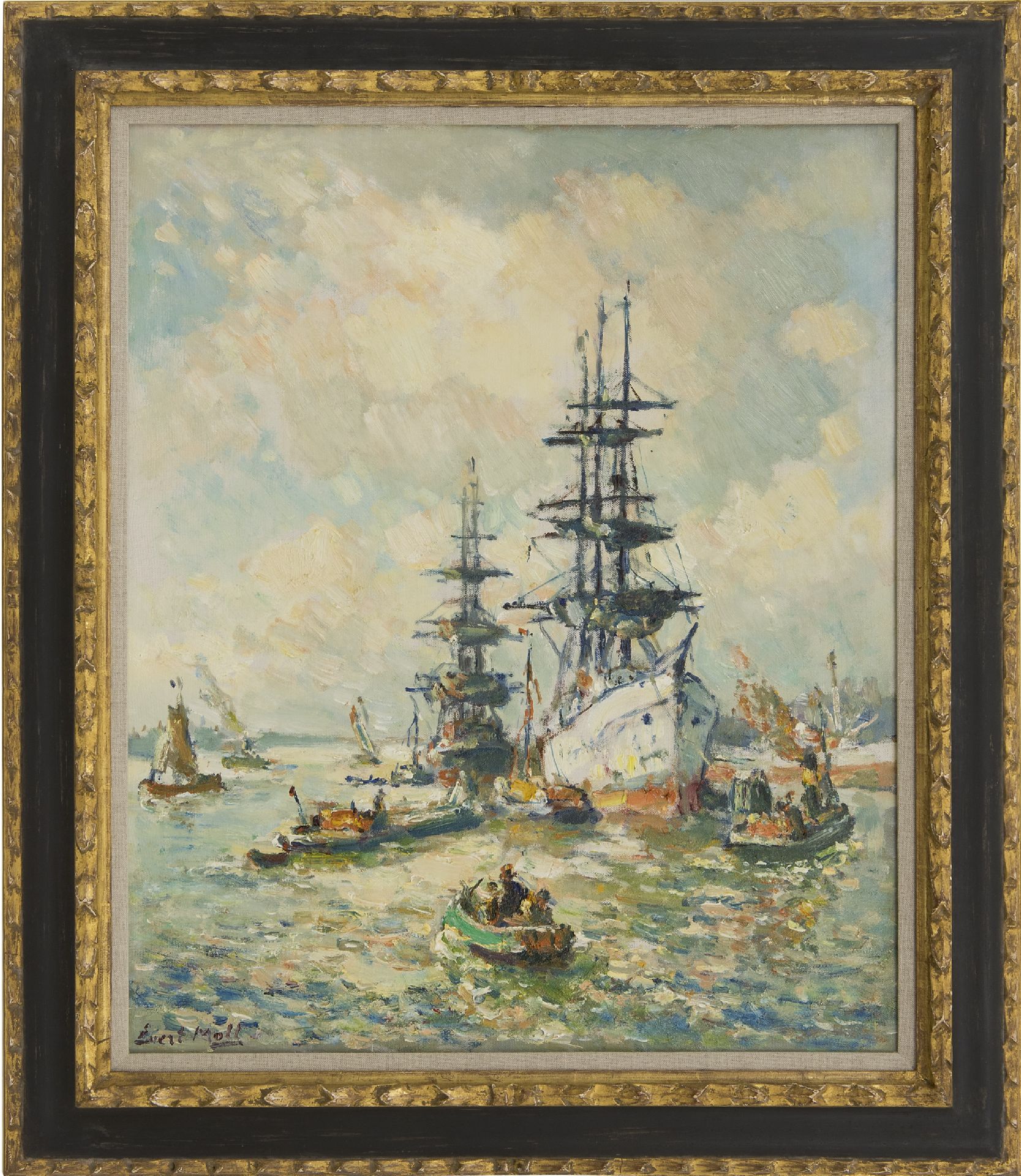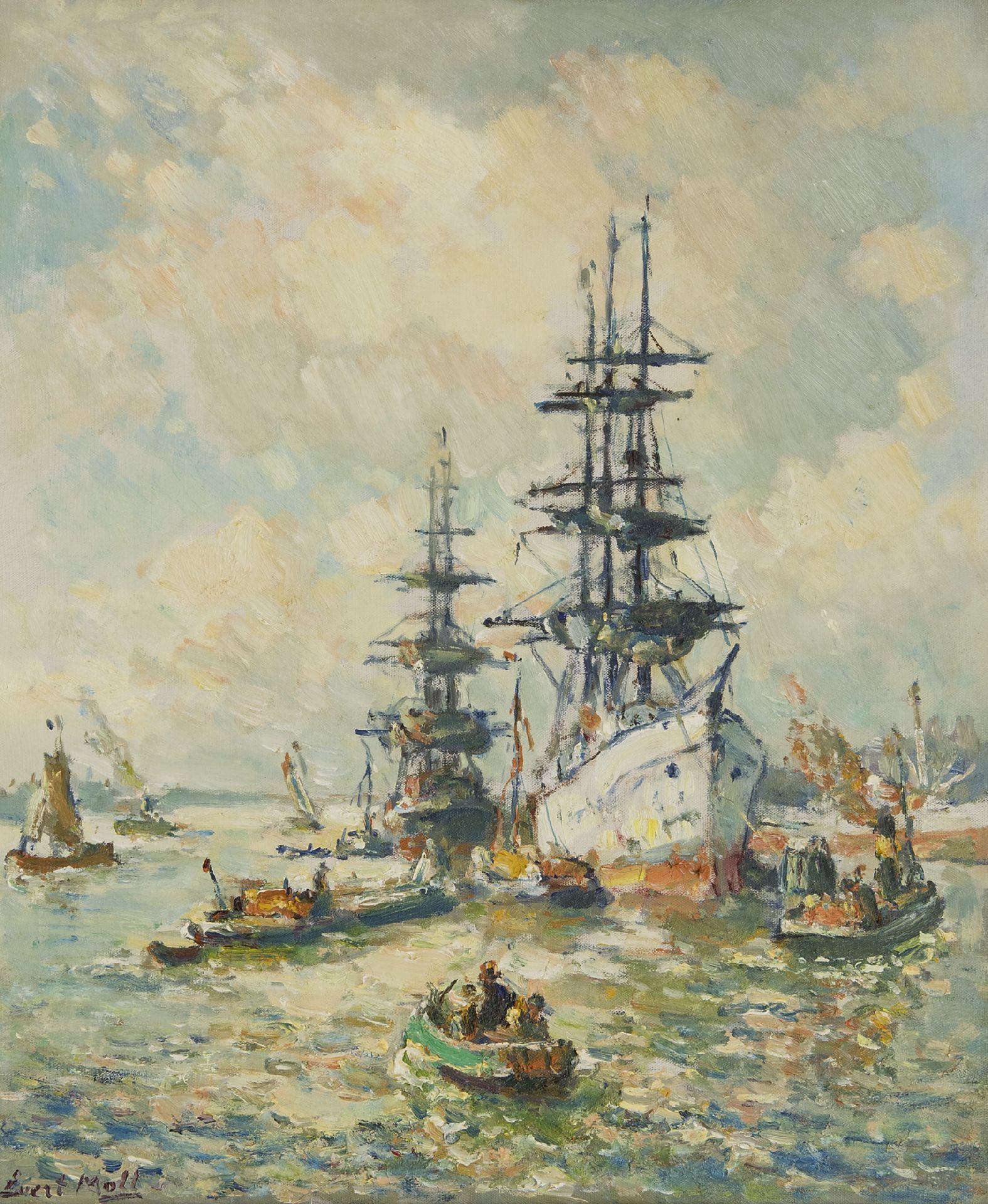 Evert Moll wurde am bekanntesten für seine Porträts des Rotterdamer Hafens und der Schifffahrt auf der Nieuwe Maas, die er in den 1920er und 30er Jahren des letzten Jahrhunderts malte. Evert Moll begann um 1900 als Anhänger der Haager Schule und wechselte bald sein Arbeitsgebiet zu den Kais und Brücken des Maasstad. Die Dynamik des Hafengeschäfts war auch eine Inspirationsquelle für den Maler. Darüber hinaus hat er sich in vielen anderen Genres hervorgetan. Er malte auch Stadtlandschaften, Landschaften und farbenfrohe, gewagte Blumenstillleben. Evert Moll war Autodidakt, erhielt jedoch Ratschläge von Willem Maris und Willem Roelofs.