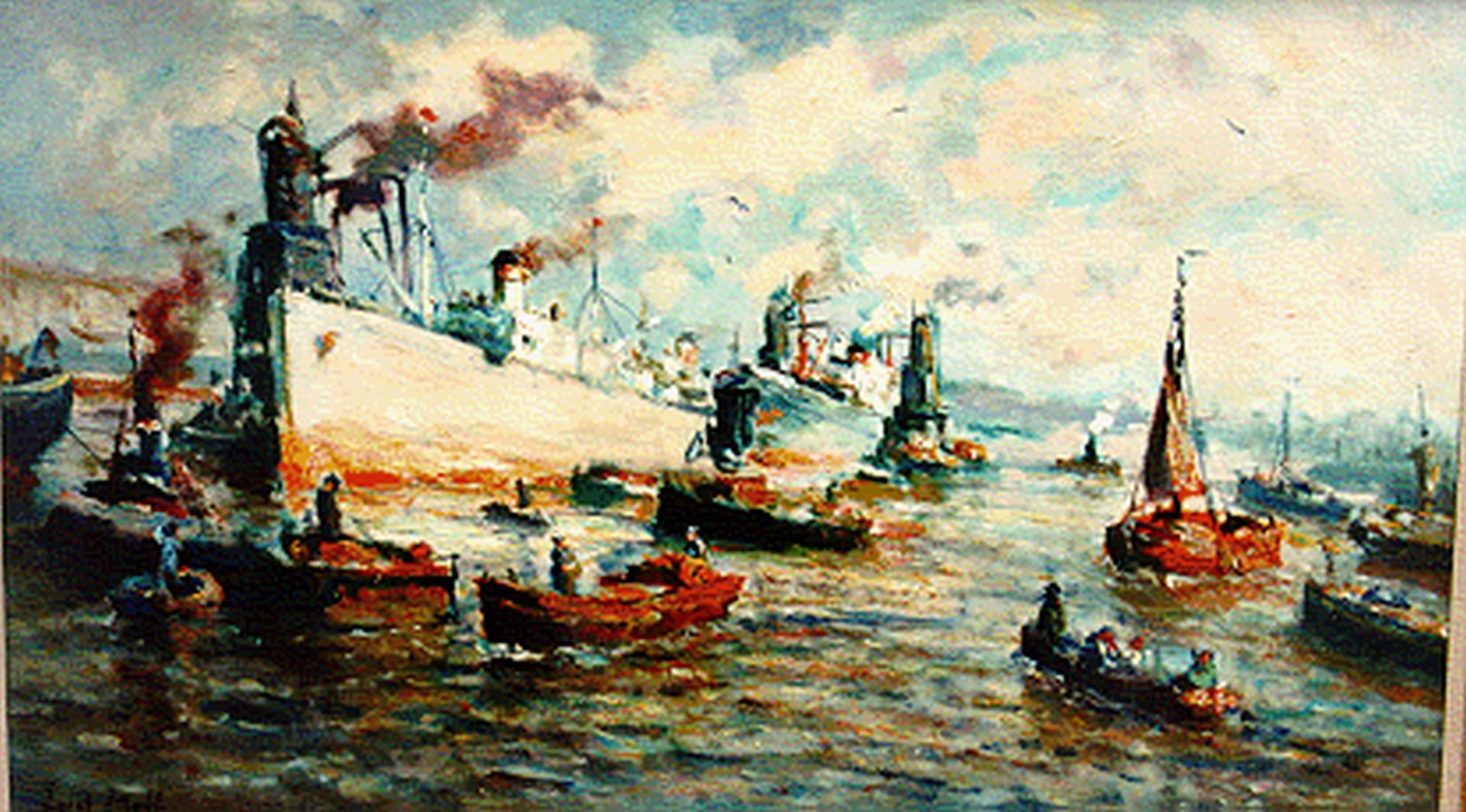 Evert Moll Kunstwerk • Gemälde • zuvor zu verkaufen Harbour activities, Rotterdam