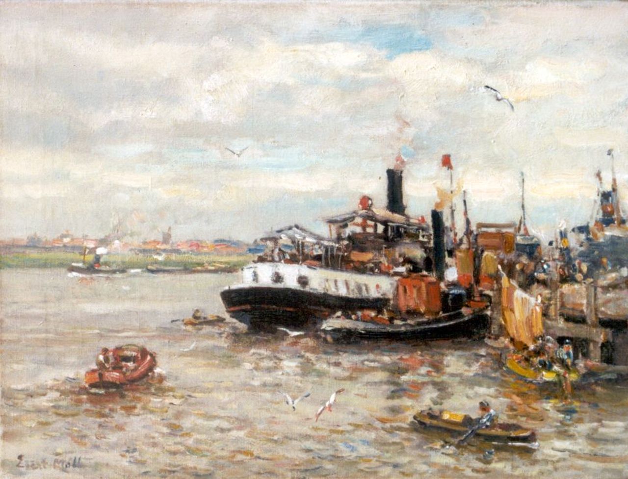 Evert Moll wurde am bekanntesten für seine Porträts des Rotterdamer Hafens und der Schifffahrt auf der Nieuwe Maas, die er in den 1920er und 30er Jahren des letzten Jahrhunderts malte. Evert Moll begann um 1900 als Anhänger der Haager Schule und wechselte bald sein Arbeitsgebiet zu den Kais und Brücken des Maasstad. Die Dynamik des Hafengeschäfts war auch eine Inspirationsquelle für den Maler. Darüber hinaus hat er sich in vielen anderen Genres hervorgetan. Er malte auch Stadtlandschaften, Landschaften und farbenfrohe, gewagte Blumenstillleben. Evert Moll war Autodidakt, erhielt jedoch Ratschläge von Willem Maris und Willem Roelofs.