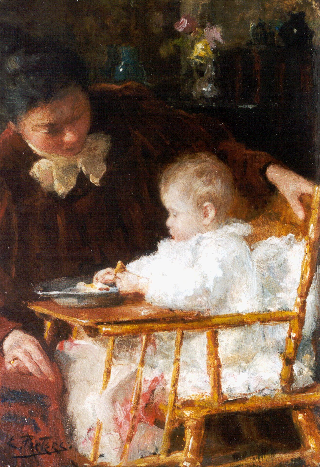 Evert Pieters, geboren 1856 in Amsterdam, reiste ab nach der Akademie der bildenden Künste in Antwerpen im Alter von 23 Jahren. Nach einem Aufenthalt in Belgien und Paris ließ er sich in Blaricum nieder, wo ihn die Gooi-Bauernbevölkerung dazu inspirierte, sonnige Bauerninterieurs von Müttern mit spielenden Kindern und Gärten in voller Blüte zu malen. Seine südländische, farbenfrohe Palette unterscheidet ihn von anderen Gooi-Malern wie Neuhuys und Kever. Während dieser Zeit in Gooi freundete sich die Familie Pieters mit den Kunstsammlern William und Anna Singer an, die ebenfalls Werke von Pieters kauften. Evert Pieters war mit seiner Arbeit sehr erfolgreich, insbesondere bei den Amerikanern, die unser Land besuchten. Der Maler zeichnete sich auch durch das Malen von Strandszenen mit Garnelen- und Muschelfischern in Katwijk aus. Nach 1920 malte er eine Reihe von Porträts und Akten von verträumten Impressionisten.