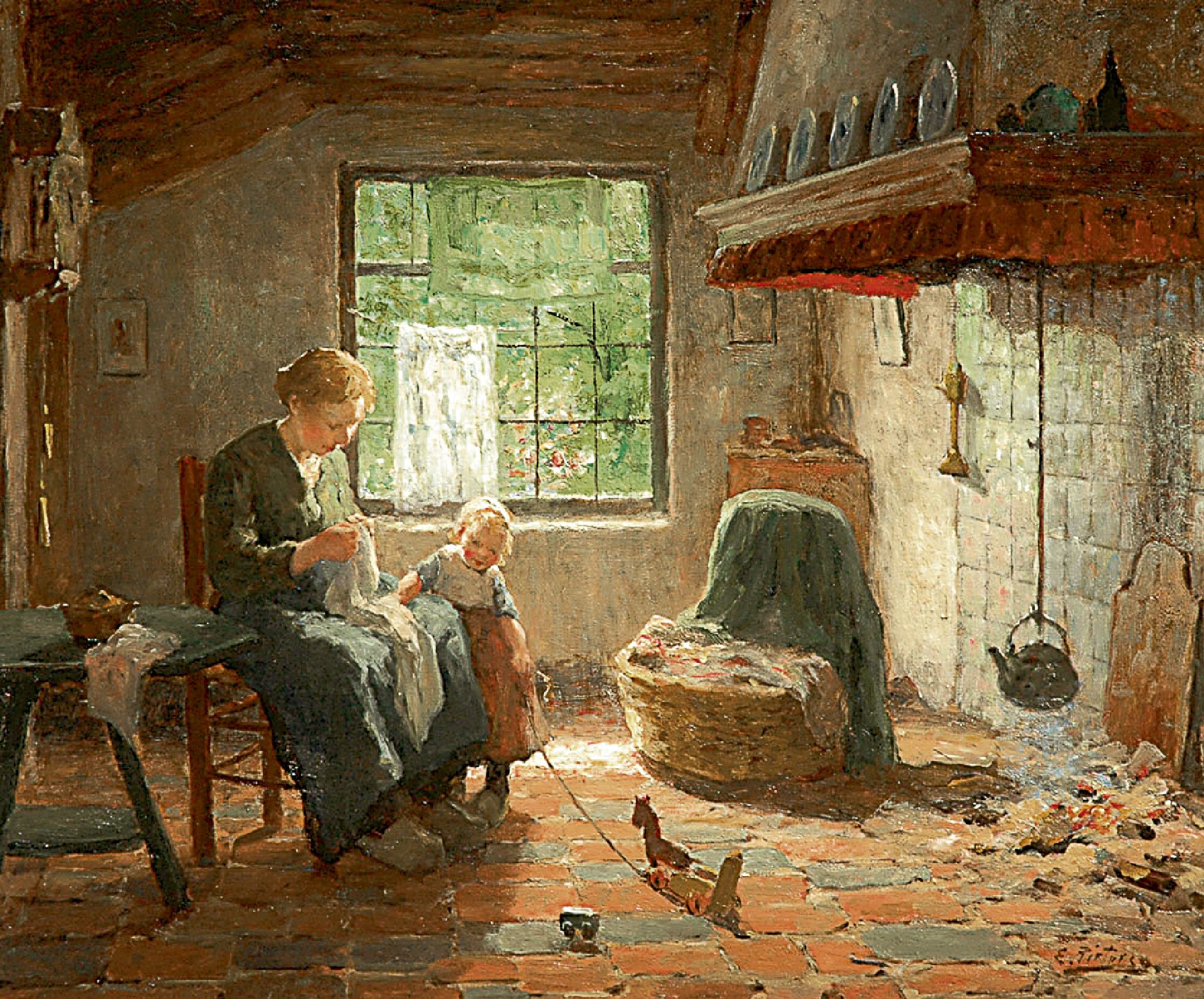 Evert Pieters, geboren 1856 in Amsterdam, reiste ab nach der Akademie der bildenden Künste in Antwerpen im Alter von 23 Jahren. Nach einem Aufenthalt in Belgien und Paris ließ er sich in Blaricum nieder, wo ihn die Gooi-Bauernbevölkerung dazu inspirierte, sonnige Bauerninterieurs von Müttern mit spielenden Kindern und Gärten in voller Blüte zu malen. Seine südländische, farbenfrohe Palette unterscheidet ihn von anderen Gooi-Malern wie Neuhuys und Kever. Während dieser Zeit in Gooi freundete sich die Familie Pieters mit den Kunstsammlern William und Anna Singer an, die ebenfalls Werke von Pieters kauften. Evert Pieters war mit seiner Arbeit sehr erfolgreich, insbesondere bei den Amerikanern, die unser Land besuchten. Der Maler zeichnete sich auch durch das Malen von Strandszenen mit Garnelen- und Muschelfischern in Katwijk aus. Nach 1920 malte er eine Reihe von Porträts und Akten von verträumten Impressionisten.