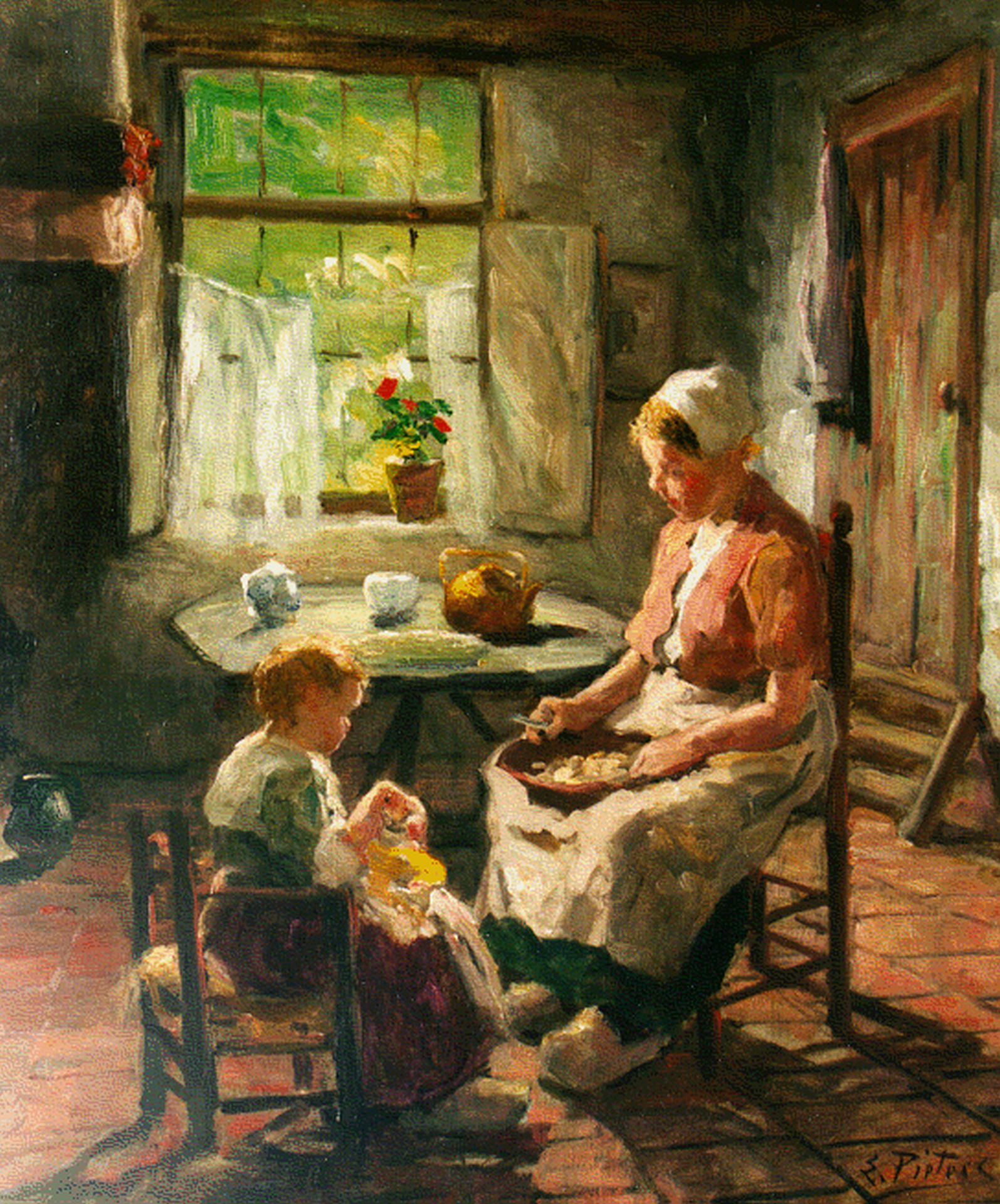 Evert Pieters, geboren 1856 in Amsterdam, reiste ab nach der Akademie der bildenden Künste in Antwerpen im Alter von 23 Jahren. Nach einem Aufenthalt in Belgien und Paris ließ er sich in Blaricum nieder, wo ihn die Gooi-Bauernbevölkerung dazu inspirierte, sonnige Bauerninterieurs von Müttern mit spielenden Kindern und Gärten in voller Blüte zu malen. Seine südländische, farbenfrohe Palette unterscheidet ihn von anderen Gooi-Malern wie Neuhuys und Kever. Während dieser Zeit in Gooi freundete sich die Familie Pieters mit den Kunstsammlern William und Anna Singer an, die ebenfalls Werke von Pieters kauften. Evert Pieters war mit seiner Arbeit sehr erfolgreich, insbesondere bei den Amerikanern, die unser Land besuchten. Der Maler zeichnete sich auch durch das Malen von Strandszenen mit Garnelen- und Muschelfischern in Katwijk aus. Nach 1920 malte er eine Reihe von Porträts und Akten von verträumten Impressionisten.