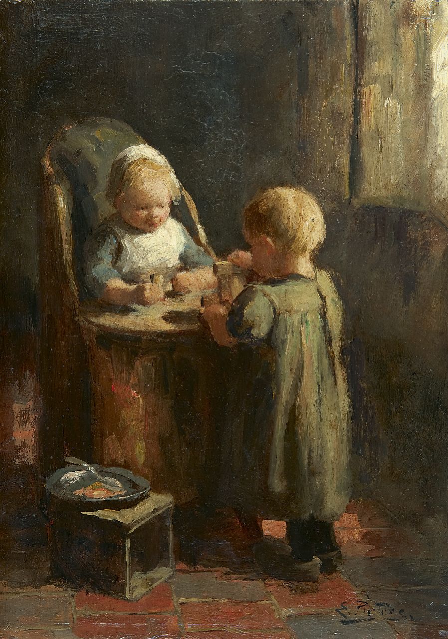 Evert Pieters, geboren 1856 in Amsterdam, reiste ab nach der Akademie der bildenden Künste in Antwerpen im Alter von 23 Jahren. Nach einem Aufenthalt in Belgien und Paris ließ er sich in Blaricum nieder, wo ihn die Gooi-Bauernbevölkerung dazu inspirierte, sonnige Bauerninterieurs von Müttern mit spielenden Kindern und Gärten in voller Blüte zu malen. Seine südländische, farbenfrohe Palette unterscheidet ihn von anderen Gooi-Malern wie Neuhuys und Kever. Während dieser Zeit in Gooi freundete sich die Familie Pieters mit den Kunstsammlern William und Anna Singer an, die ebenfalls Werke von Pieters kauften. Evert Pieters war mit seiner Arbeit sehr erfolgreich, insbesondere bei den Amerikanern, die unser Land besuchten. Der Maler zeichnete sich auch durch das Malen von Strandszenen mit Garnelen- und Muschelfischern in Katwijk aus. Nach 1920 malte er eine Reihe von Porträts und Akten von verträumten Impressionisten.