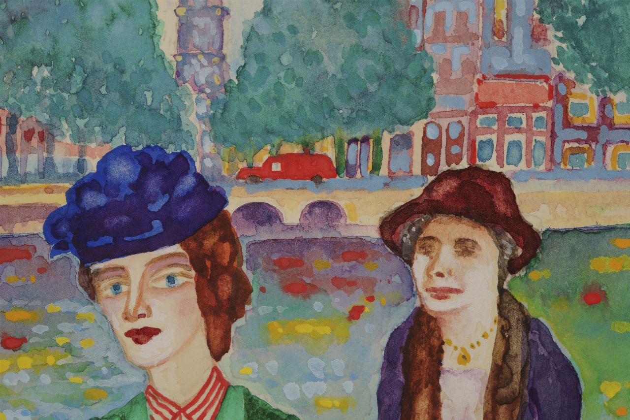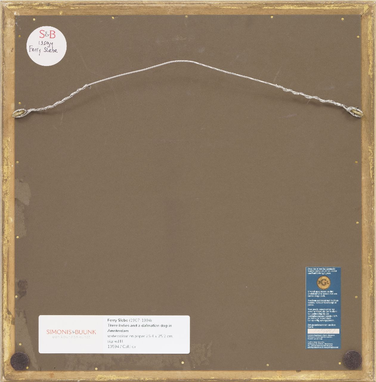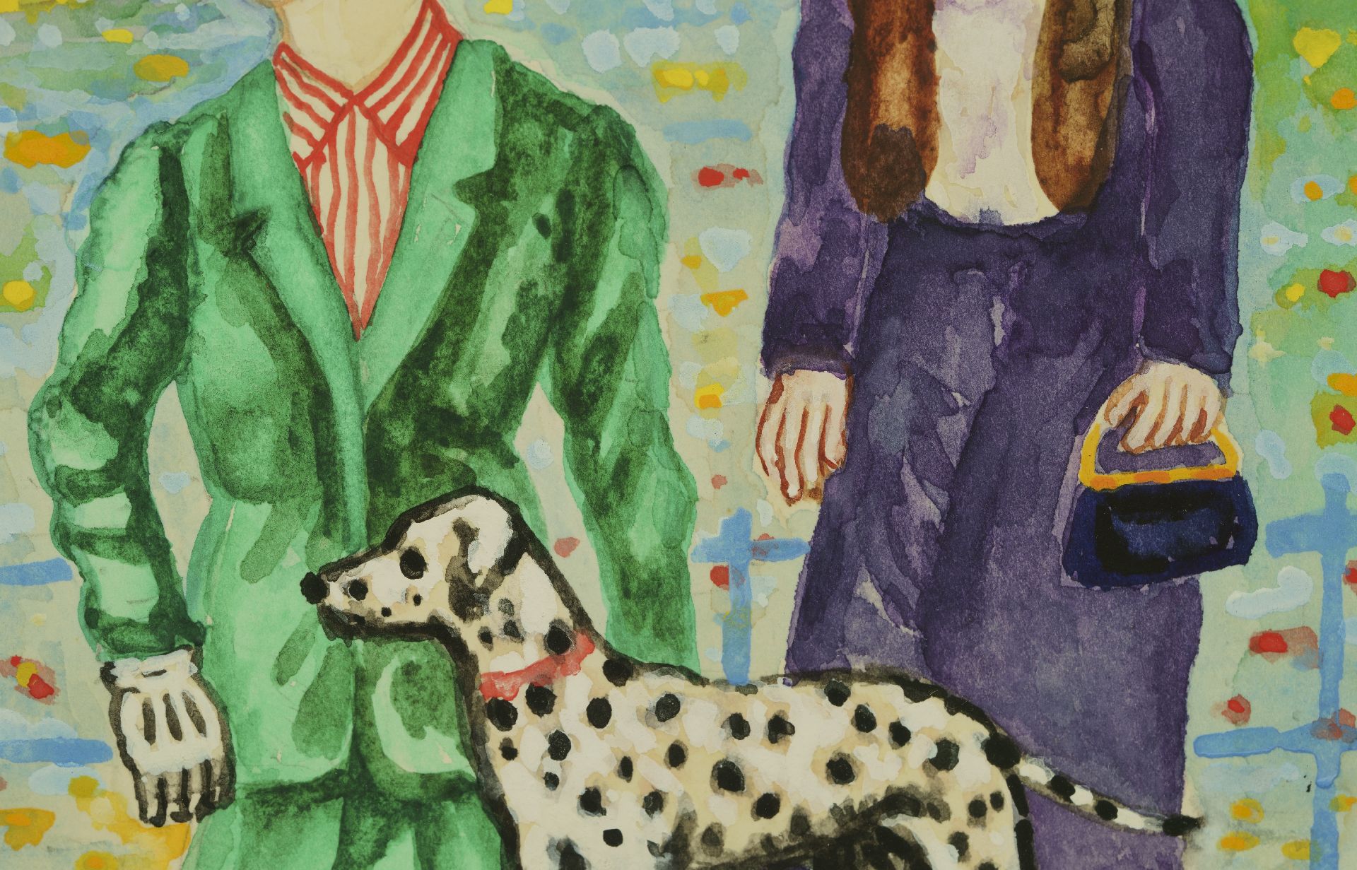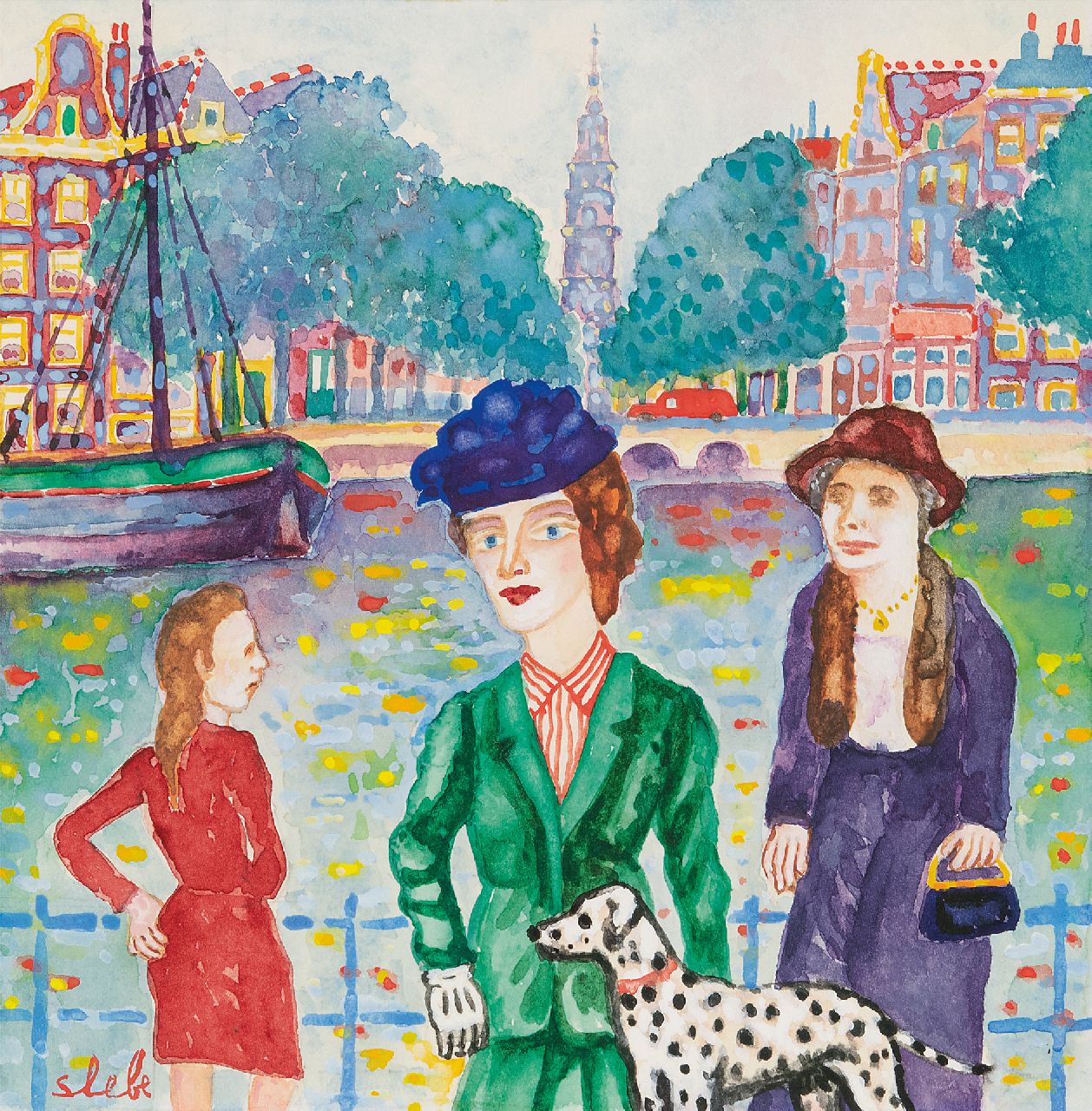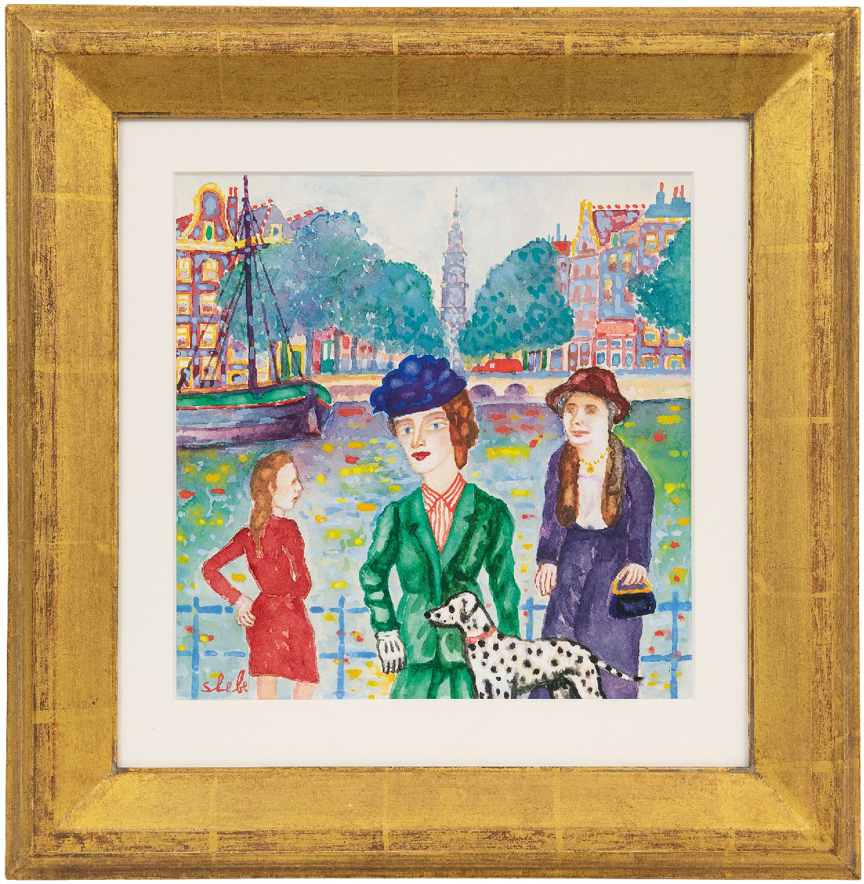Ferry Slebe Kunstwerk • Aquarell • Zeichnung • zuvor zu verkaufen Drei Frauen und ein Dalmatier in Amsterdam