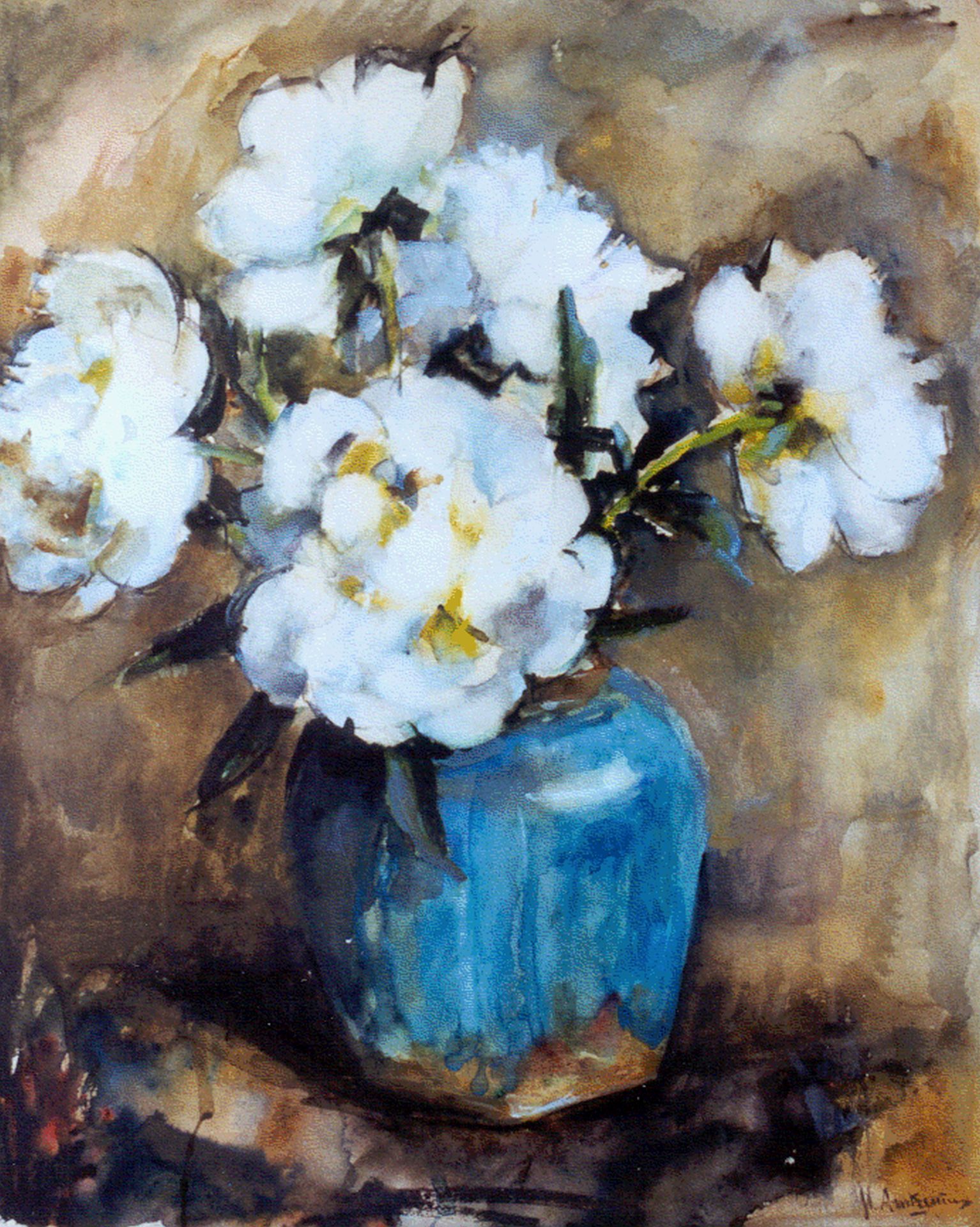 Floris Arntzenius Kunstwerk • Aquarell • Zeichnung • zuvor zu verkaufen Still life with peonies in a blue vase