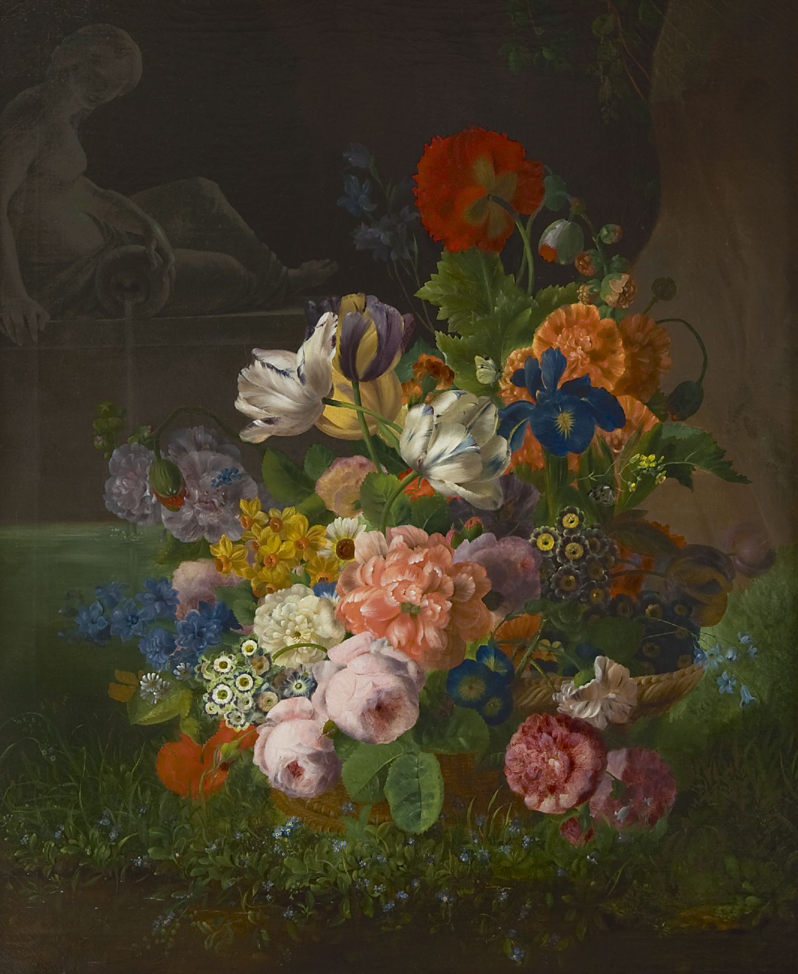 François van Geit Kunstwerk • Gemälde • zuvor zu verkaufen Flowers in a basket by a pond