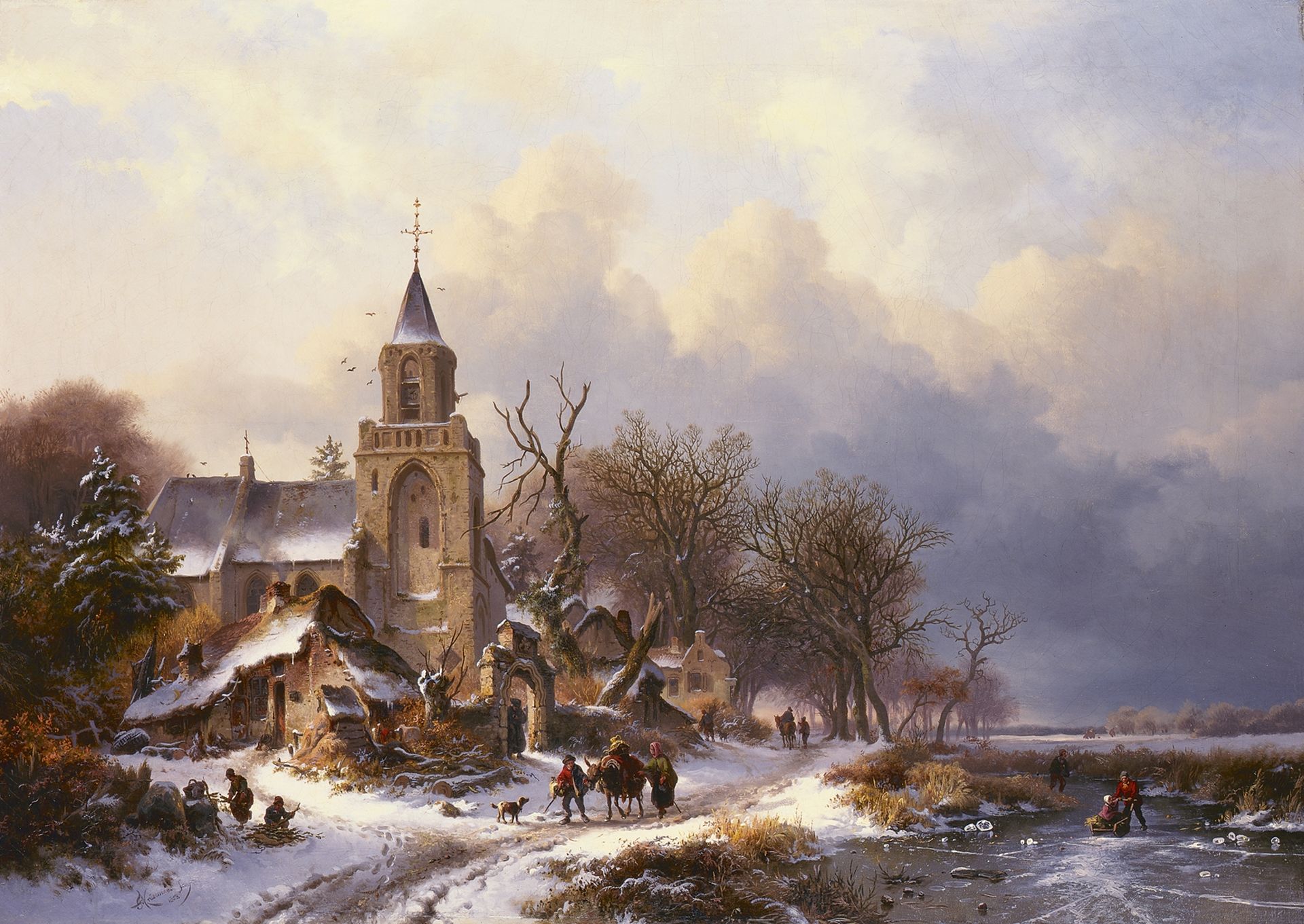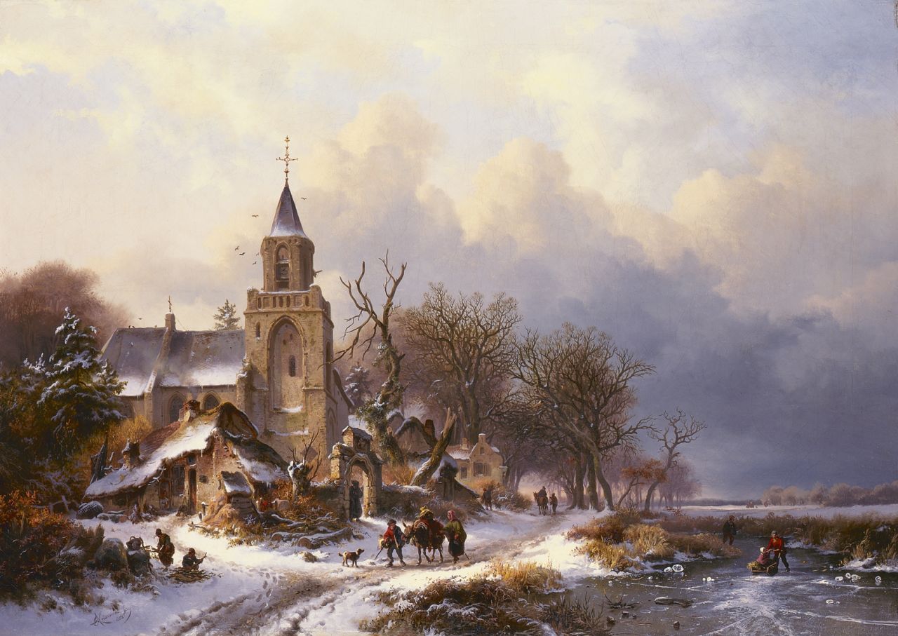 Frederik Marinus Kruseman Kunstwerk • Gemälde • zuvor zu verkaufen A winter landscape with figures on the ice, a church in the distance
