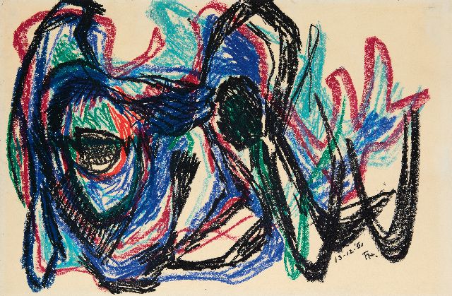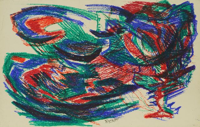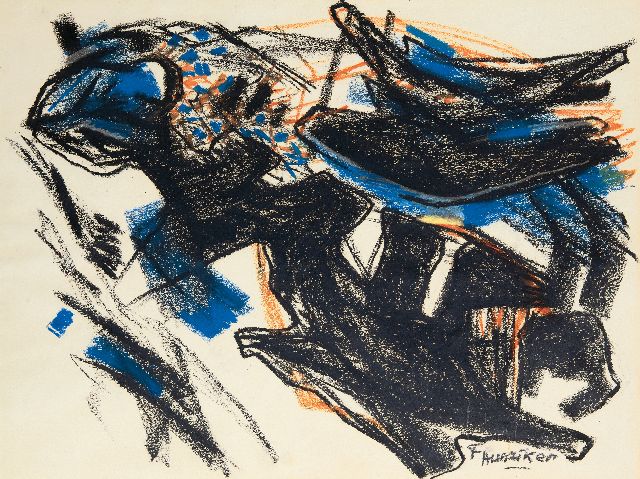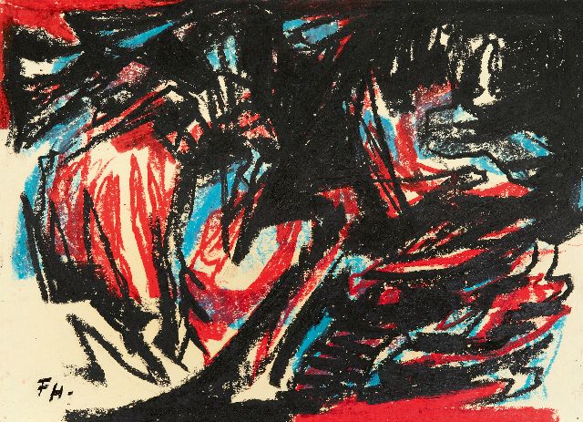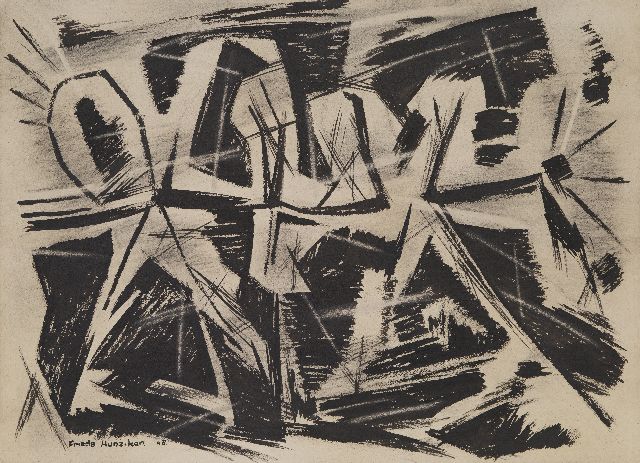 Frieda Hunziker galt in den 1950er und 1960er Jahren als bemerkenswerte und fortschrittliche Künstlerin. Zunächst war sie Zeichenlehrerin, bis sie in den 1930er Jahren begann, selbständig zu arbeiten. Ihr Frühwerk zeichnet sich durch einen vereinfachten, realistischen Stil aus. 1948 gelangte sie zur vollständigen Abstraktion. Im Jahr zuvor war sie eine der Gründer von Vrij Beelden. Diese Künstlergruppe stellte regelmäßig im Stedelijk Museum in Amsterdam aus und nahm neben den Experimentals und Cobra in der Suche nach Nicht-Figuralität einen vollwertigen Platz ein. Hunziker war die einzige Frau in der Gruppe und zugleich eines der aktivsten Mitglieder.