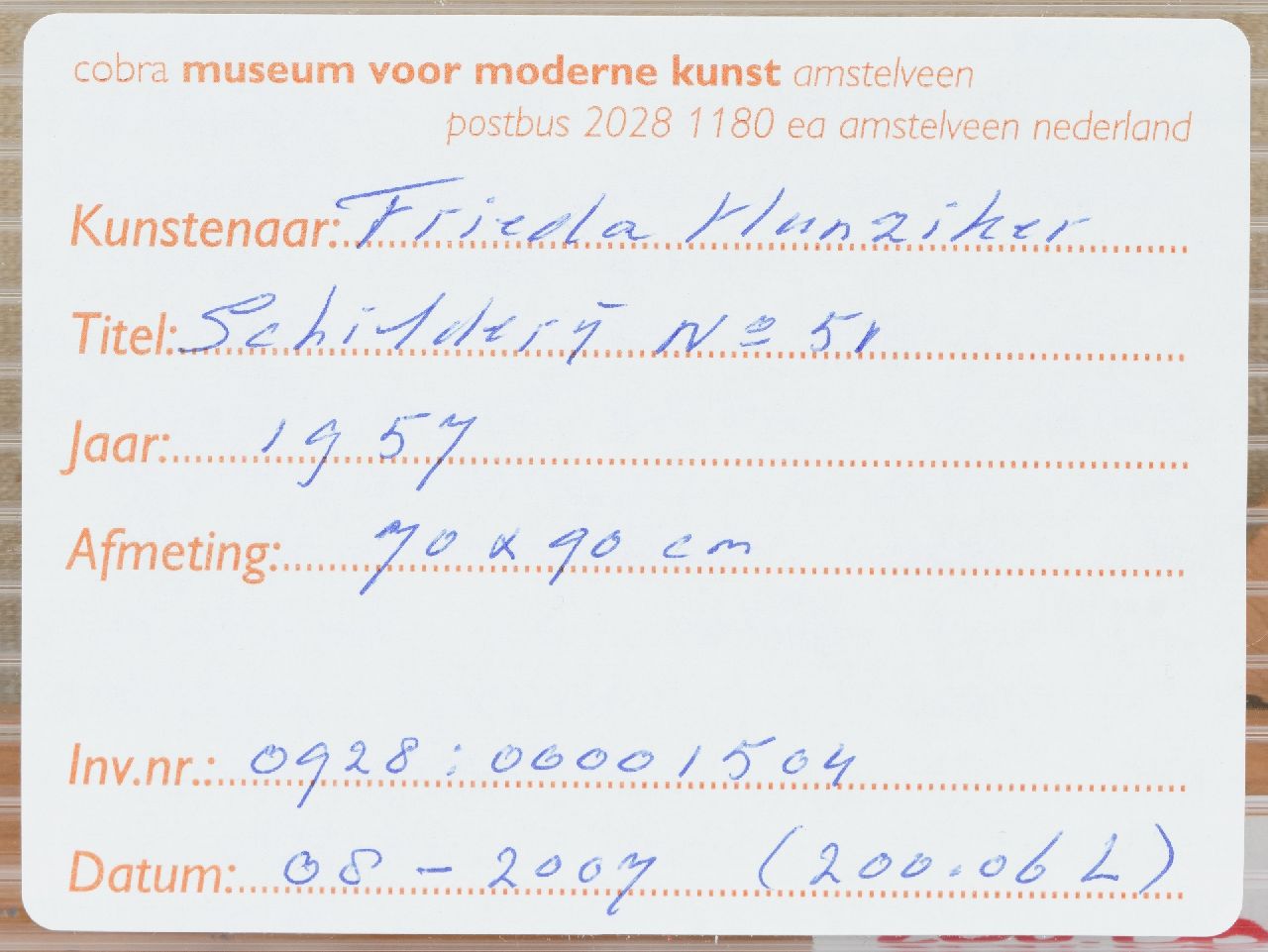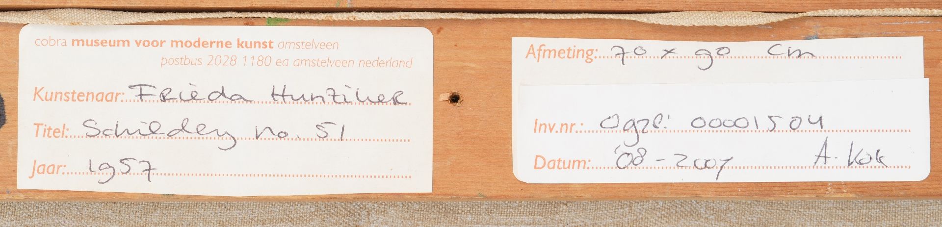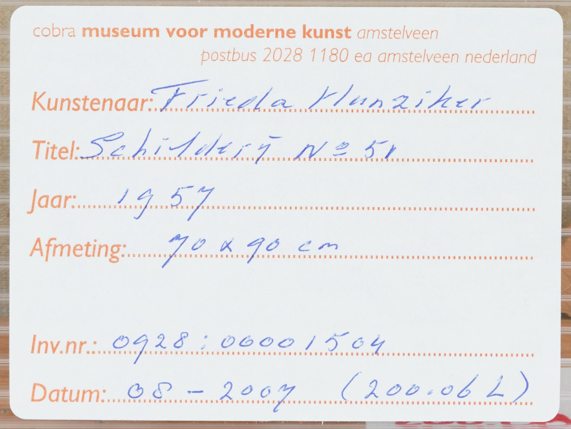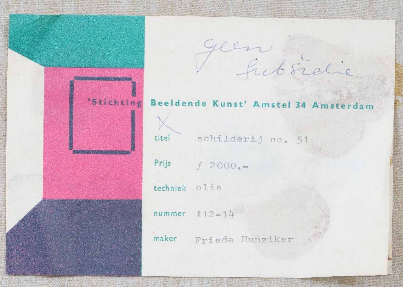 Frieda Hunziker galt in den 1950er und 1960er Jahren als bemerkenswerte und fortschrittliche Künstlerin. Zunächst war sie Zeichenlehrerin, bis sie in den 1930er Jahren begann, selbständig zu arbeiten. Ihr Frühwerk zeichnet sich durch einen vereinfachten, realistischen Stil aus. 1948 gelangte sie zur vollständigen Abstraktion. Im Jahr zuvor war sie eine der Gründer von Vrij Beelden. Diese Künstlergruppe stellte regelmäßig im Stedelijk Museum in Amsterdam aus und nahm neben den Experimentals und Cobra in der Suche nach Nicht-Figuralität einen vollwertigen Platz ein. Hunziker war die einzige Frau in der Gruppe und zugleich eines der aktivsten Mitglieder.