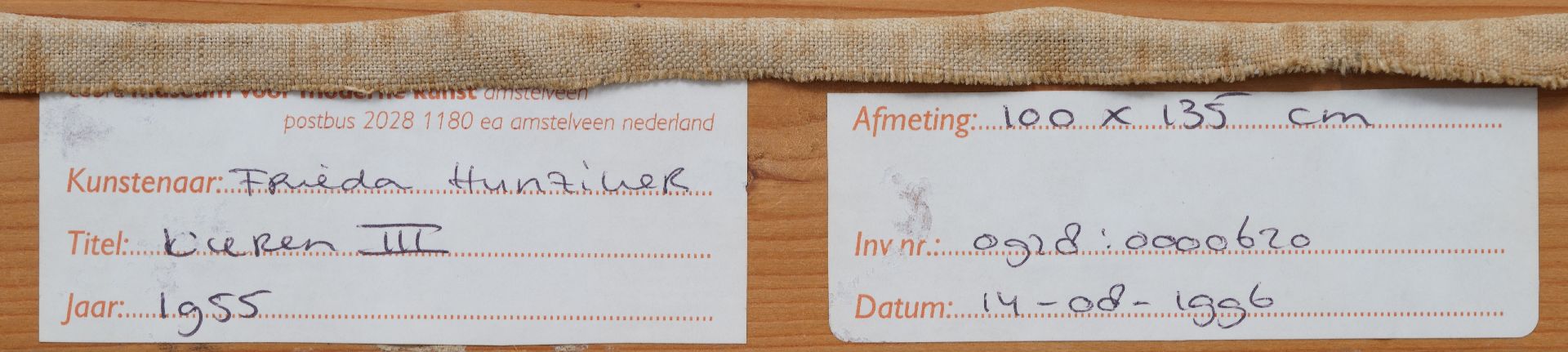 Frieda Hunziker galt in den 1950er und 1960er Jahren als bemerkenswerte und fortschrittliche Künstlerin. Zunächst war sie Zeichenlehrerin, bis sie in den 1930er Jahren begann, selbständig zu arbeiten. Ihr Frühwerk zeichnet sich durch einen vereinfachten, realistischen Stil aus. 1948 gelangte sie zur vollständigen Abstraktion. Im Jahr zuvor war sie eine der Gründer von Vrij Beelden. Diese Künstlergruppe stellte regelmäßig im Stedelijk Museum in Amsterdam aus und nahm neben den Experimentals und Cobra in der Suche nach Nicht-Figuralität einen vollwertigen Platz ein. Hunziker war die einzige Frau in der Gruppe und zugleich eines der aktivsten Mitglieder.