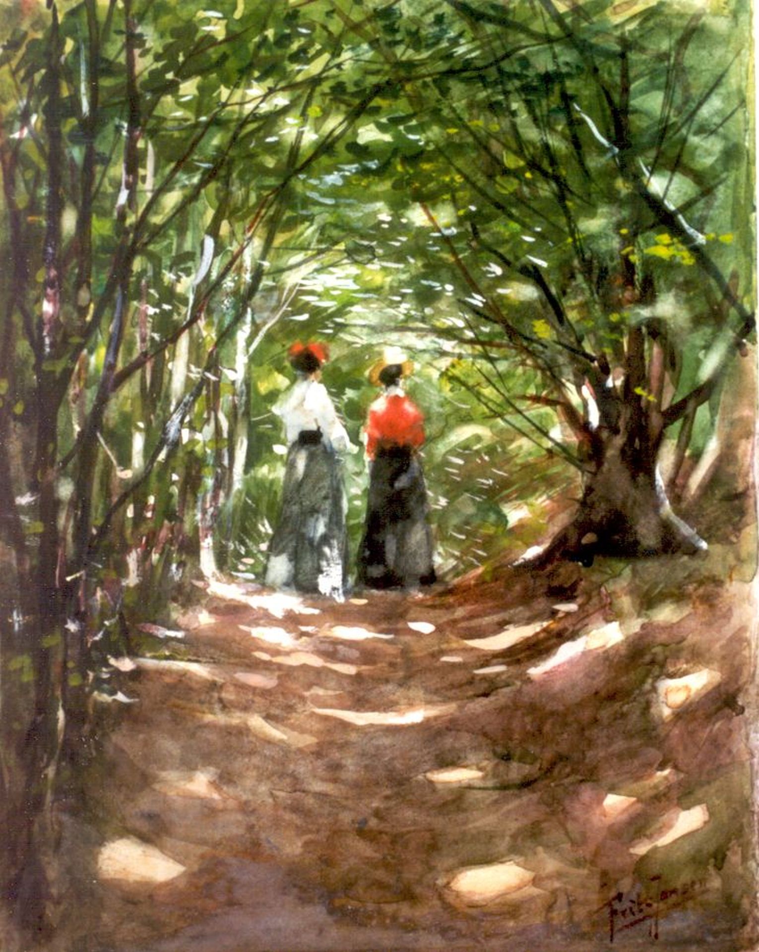 Frits Jansen Kunstwerk • Aquarell • Zeichnung • zuvor zu verkaufen Elegant ladies on a path