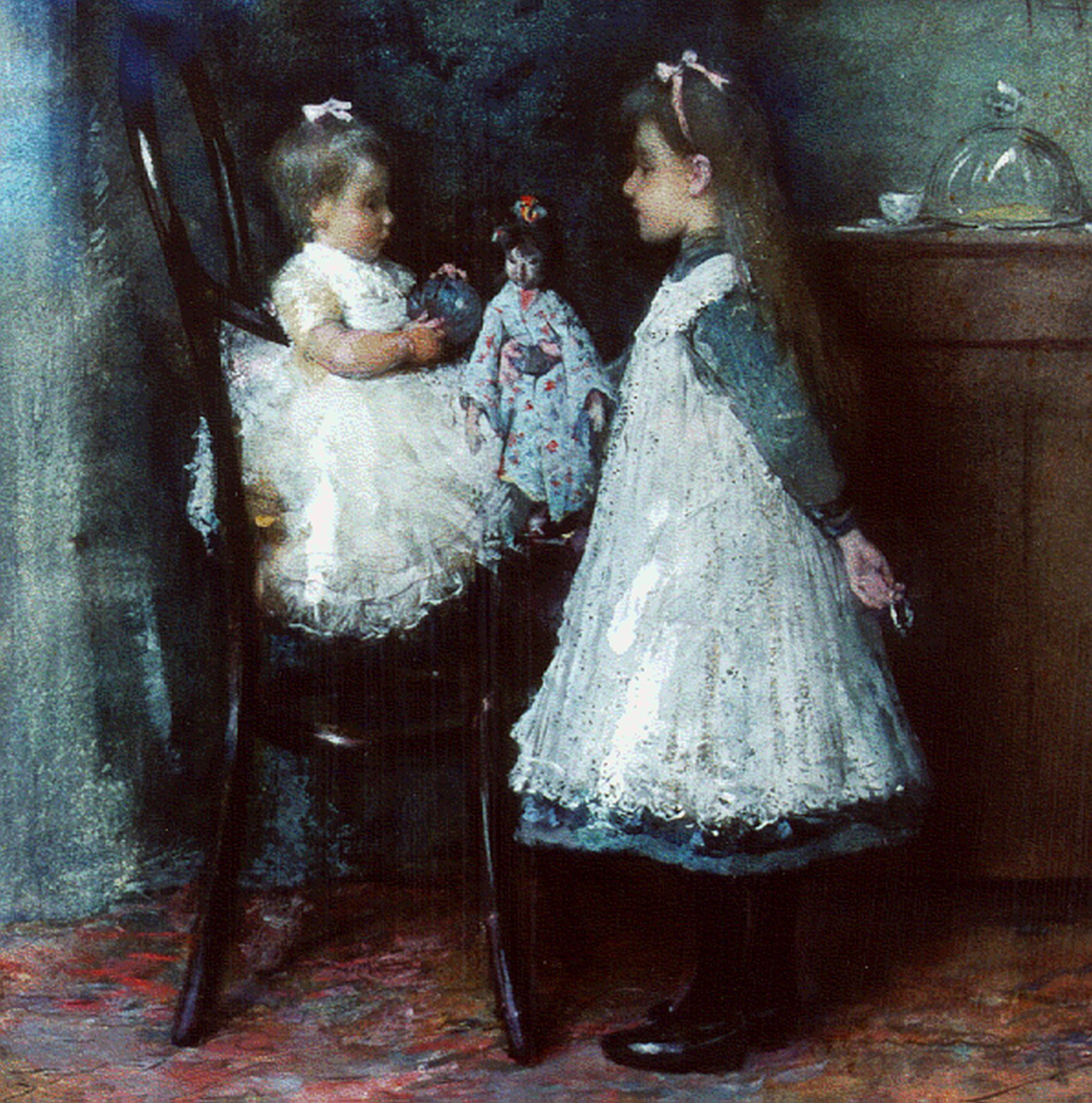 Frits Jansen Kunstwerk • Aquarell • Zeichnung • zuvor zu verkaufen Two sisters playing with a doll
