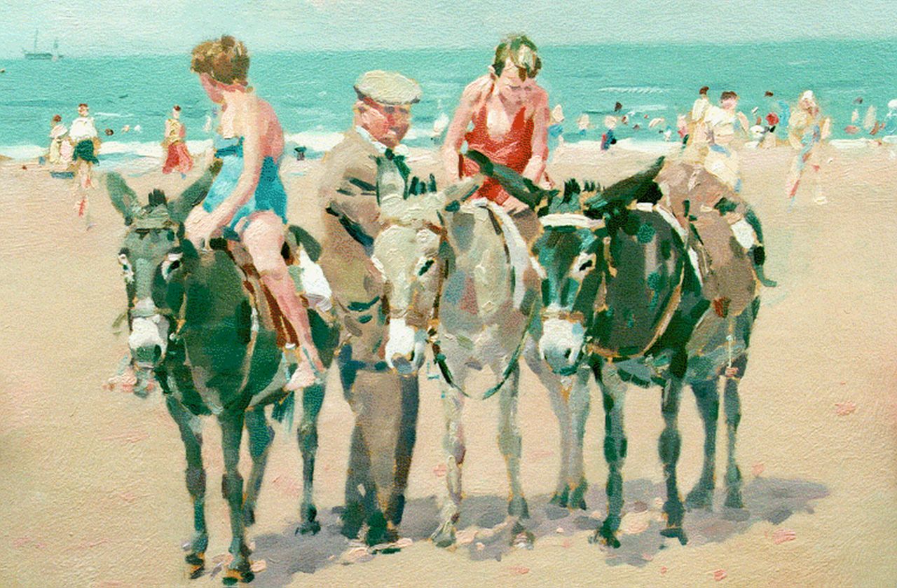 Frits Verdonk lebte und arbeitete in Den Haag, wo er Porträts, Stillleben und alte Haager Stadtviertel in einer hellen Palette und einem lockeren, impressionistischen Stil malte. Er wuchs im Waisenhaus in Gorkum auf, wo sein Zeichentalent vom Verwalter des Waisenhauses, Wittermans, entdeckt wurde. Er arrangierte Frits‘ Aufnahme an der Kunstakademie Rotterdam. Nach Wittermans‘ Tod blieb seine Frau die Geschäftsberaterin des inzwischen erfolgreichen Malers. Im Sommer war Verdonk oft an den sonnigen Stränden von Katwijk und Scheveningen anzutreffen. Dort hielt er eine beliebte Attraktion der damaligen Zeit fest: das Eselreiten am Strand, an dem Kinder für ein paar Cent teilnehmen konnten, geführt vom Eselbesitzer. Für diese Gemälde entwickelte Verdonk eine einzigartige Palette von Bonbonfarben, die die sonnige Atmosphäre der Strandszenen noch weiter betonten.