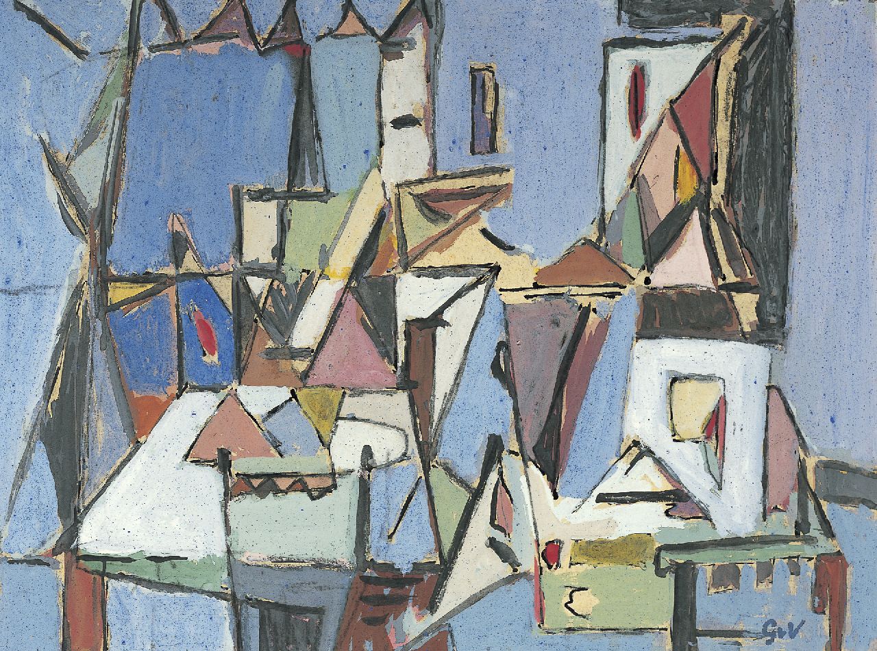 Geer van Velde ist einer der führenden Maler der Nachkriegs-École de Paris. Ursprünglich ein Anstreicher, schloss er sich 1925 seinem Bruder Bram in Paris an, um sich dort weiterzuentwickeln. Anfangs war seine Arbeit figurativer Expressionist. Insbesondere nach seinem Umzug nach Südfrankreich im Jahr 1938 fand er unter dem Einfluss des mediterranen Lichts seinen eigenen Stil; Die Realität vereinfachte sich auf vertikale, horizontale und diagonale Linien und Bereiche, die mit Farbe ausgefüllt sind. Dabei spielt die Reproduktion eines dünnen, gefilterten Lichts eine große Rolle. Figuren und Objekte sind in seiner Arbeit bis 1940 noch zu erkennen.