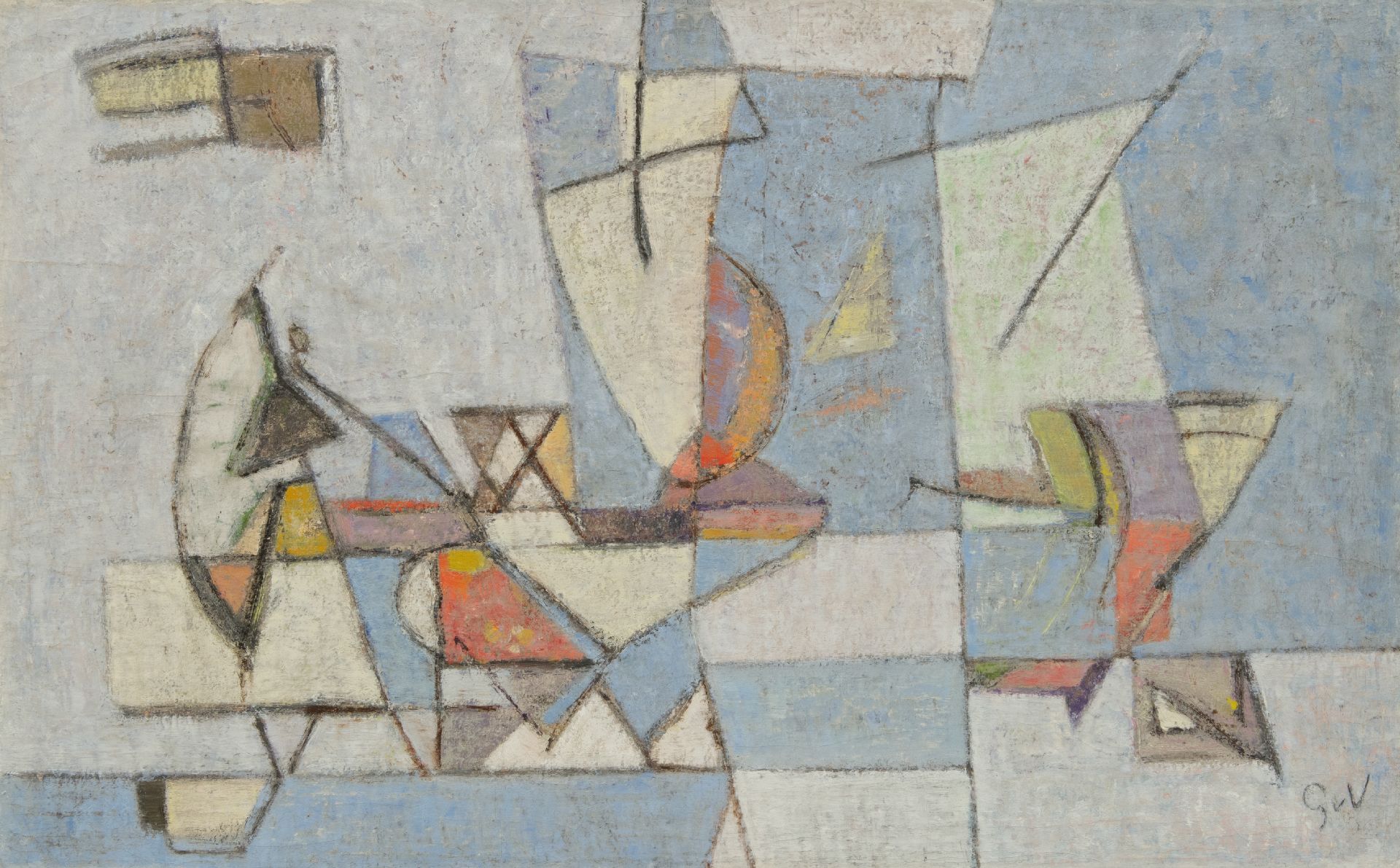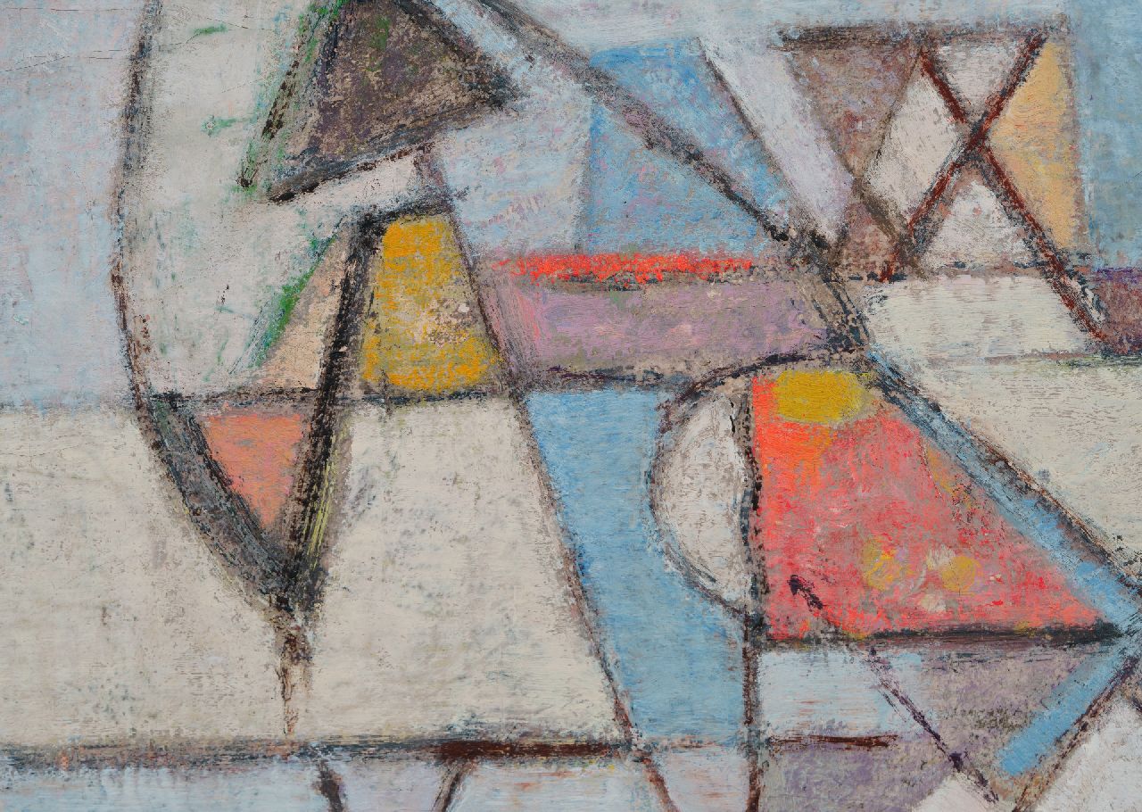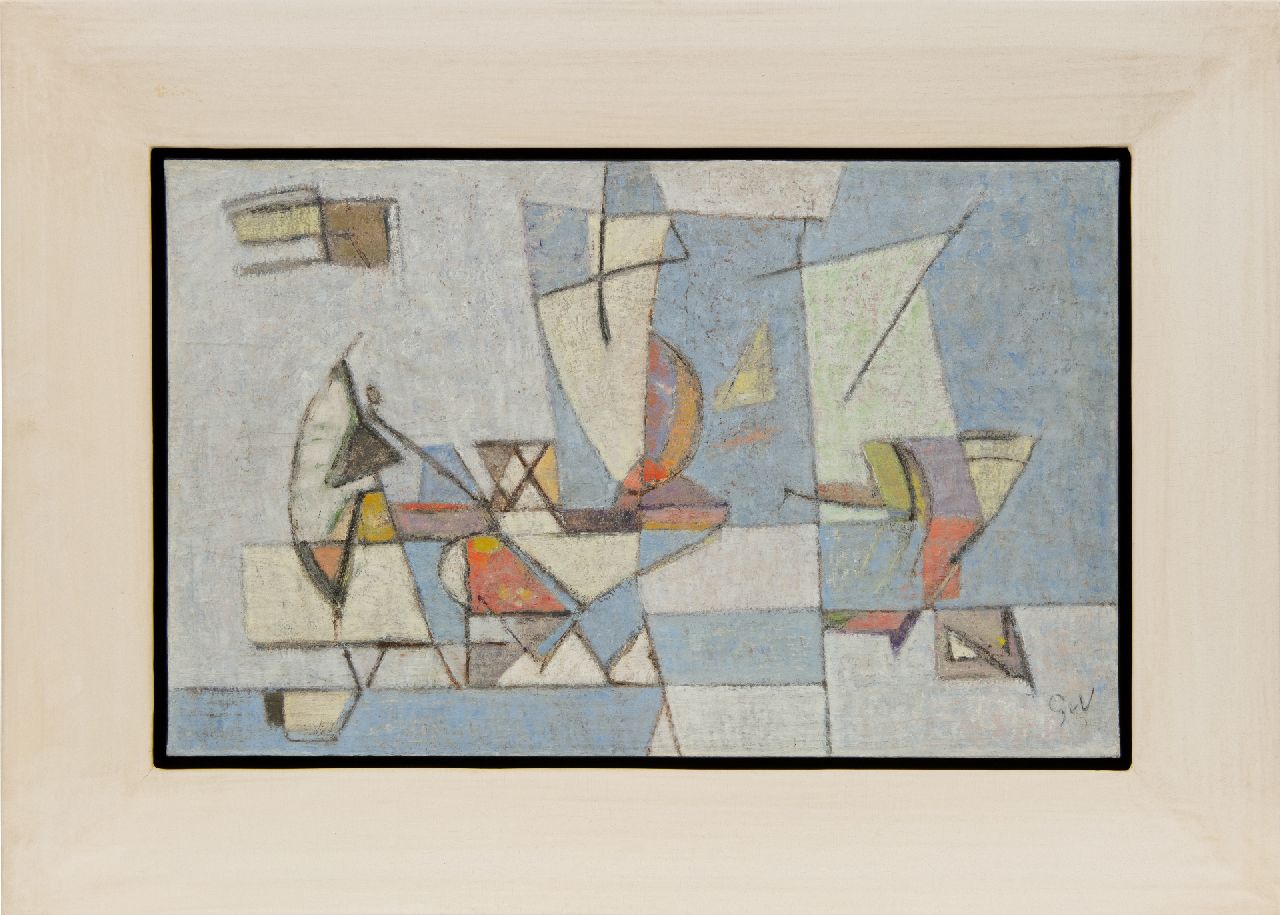 Geer van Velde ist einer der führenden Maler der Nachkriegs-École de Paris. Ursprünglich ein Anstreicher, schloss er sich 1925 seinem Bruder Bram in Paris an, um sich dort weiterzuentwickeln. Anfangs war seine Arbeit figurativer Expressionist. Insbesondere nach seinem Umzug nach Südfrankreich im Jahr 1938 fand er unter dem Einfluss des mediterranen Lichts seinen eigenen Stil; Die Realität vereinfachte sich auf vertikale, horizontale und diagonale Linien und Bereiche, die mit Farbe ausgefüllt sind. Dabei spielt die Reproduktion eines dünnen, gefilterten Lichts eine große Rolle. Figuren und Objekte sind in seiner Arbeit bis 1940 noch zu erkennen.