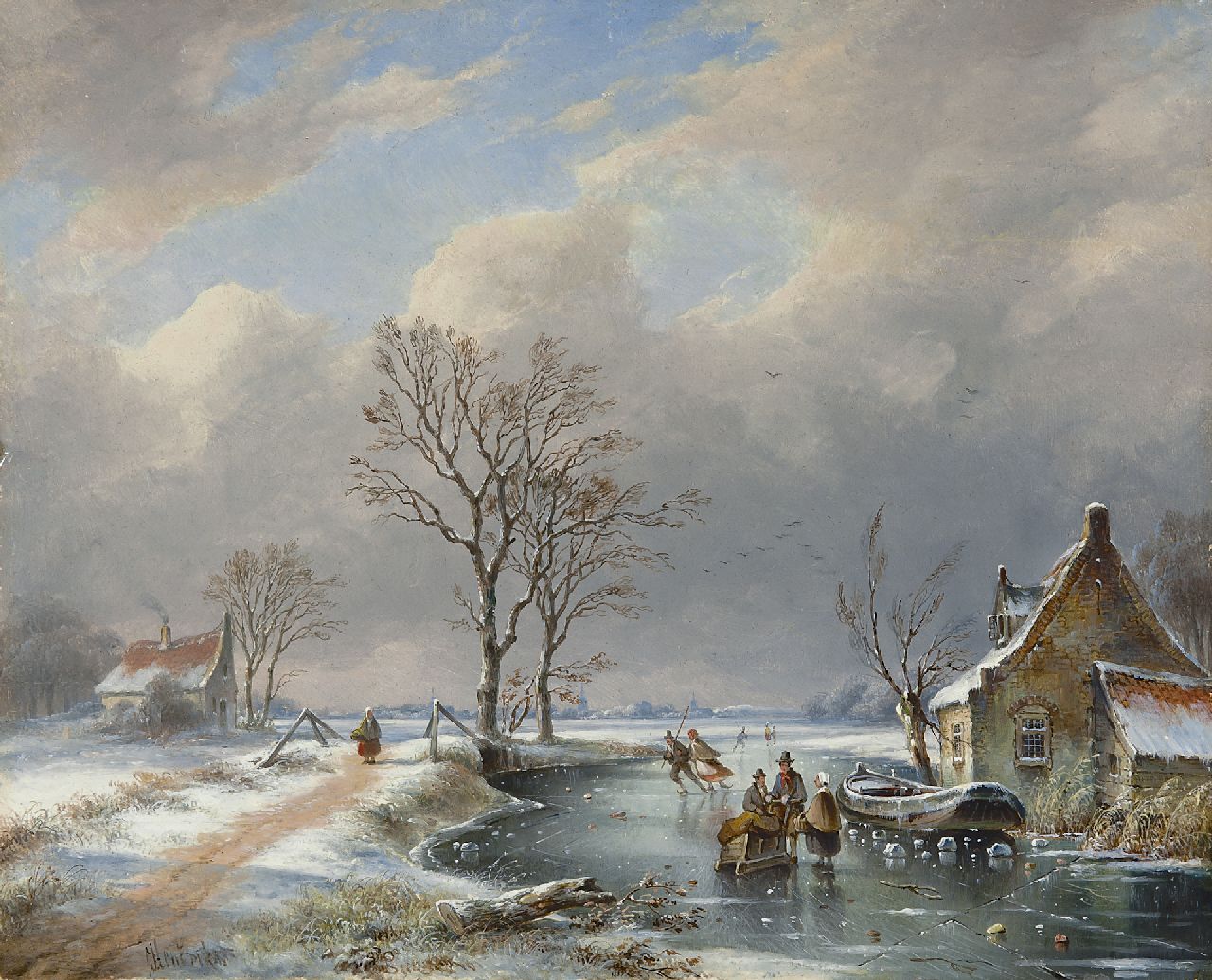 George Henry Hendriks Kunstwerk • Gemälde • zuvor zu verkaufen Winterlandschaft mit Schlittschuhläufern und Schlitten