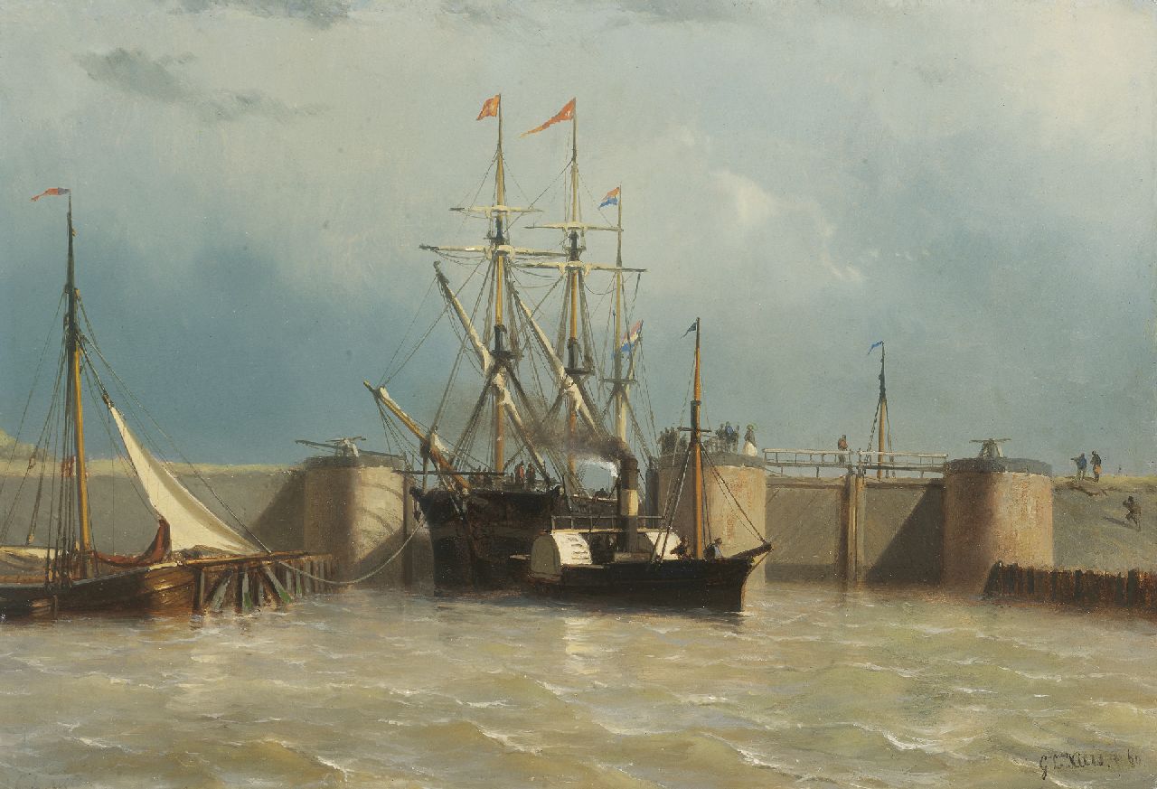 George Lourens Kiers Kunstwerk • Gemälde • zuvor zu verkaufen Paddler towboat with a three-master near the Willemsluis, Amsterdam, seen from the IJ