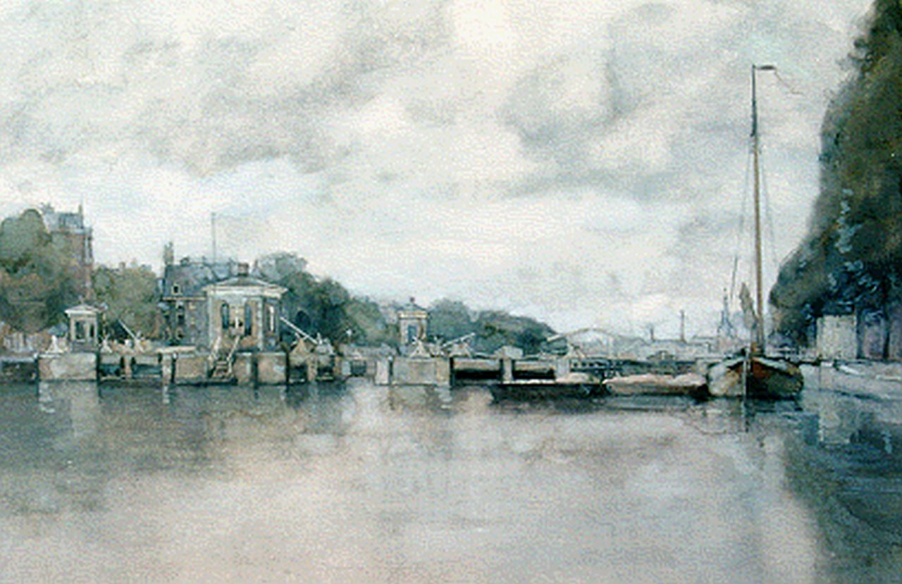Gerard Muller Kunstwerk • Aquarell • Zeichnung • zuvor zu verkaufen Flussschleusen in der Amstel mit dem Royal Theatre Carré, Amsterdam