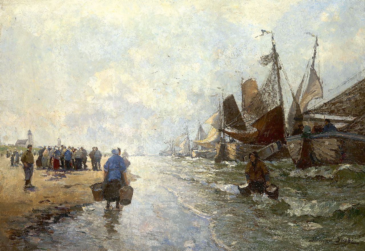 Der deutsche Maler German Grobe war Schüler der Düsseldorfer Akademie und wurde später Teil der Düsseldorfer Landschaftsmalerschule. Einer seiner Lehrer dort war der Marinemaler E.G. Ducker, der viel Einfluss auf seinen Schüler hatte. Ab 1887 verbrachte Grobe jeden Sommer im niederländischen Fischerdorf Katwijk, wo er Dorfszenen, Strandszenen und das Leben der Fischer malte. Sein impressionistischer, oft skizzenhafter Stil und die Einheitlichkeit des Tons verraten den Einfluss der Maler der Haager Schule, insbesondere Mauve und Mesdag.