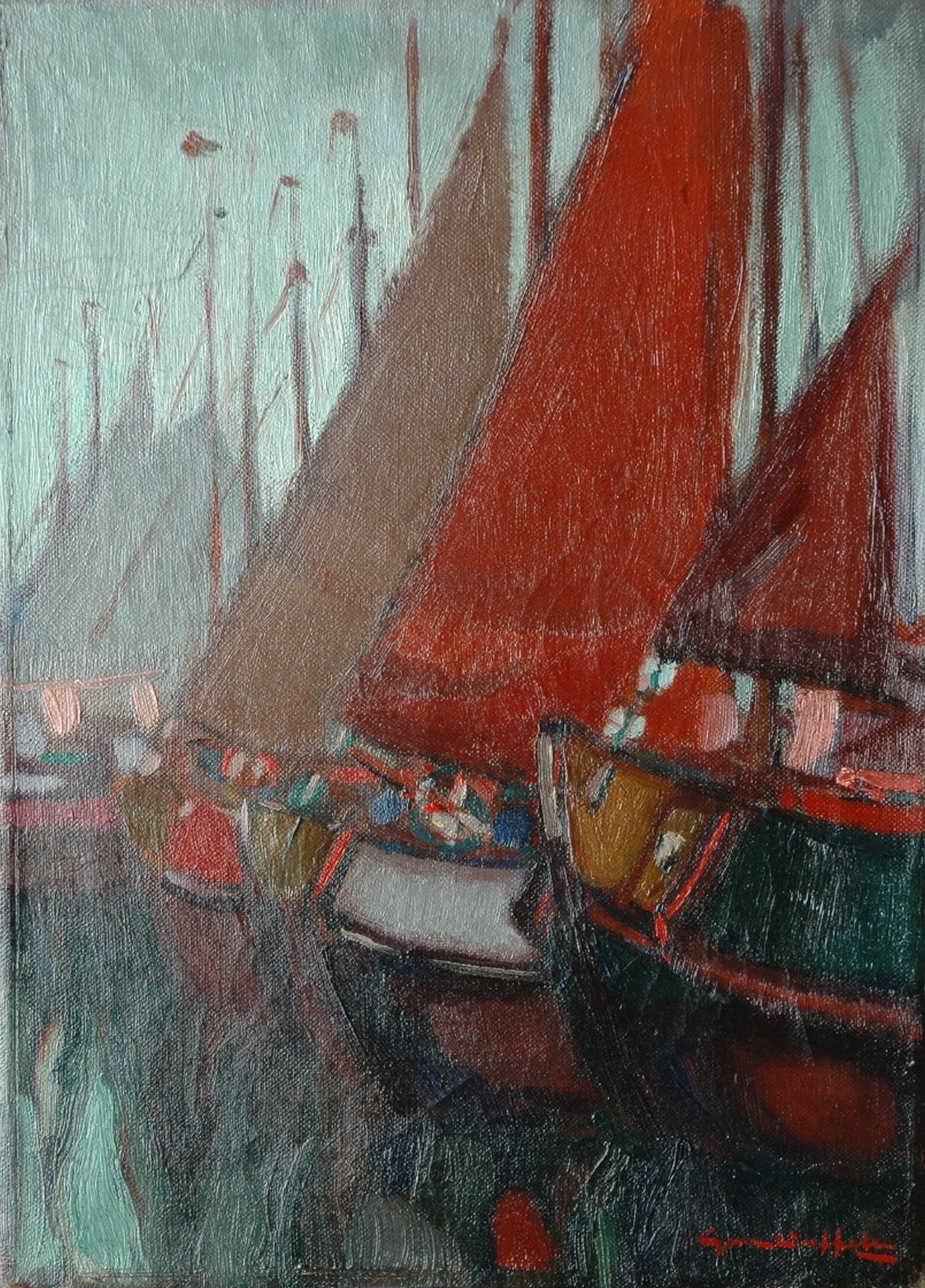 Gerrit van Duffelen Kunstwerk • Gemälde • zuvor zu verkaufen Moored fishing boats in an IJsselmeer harbour