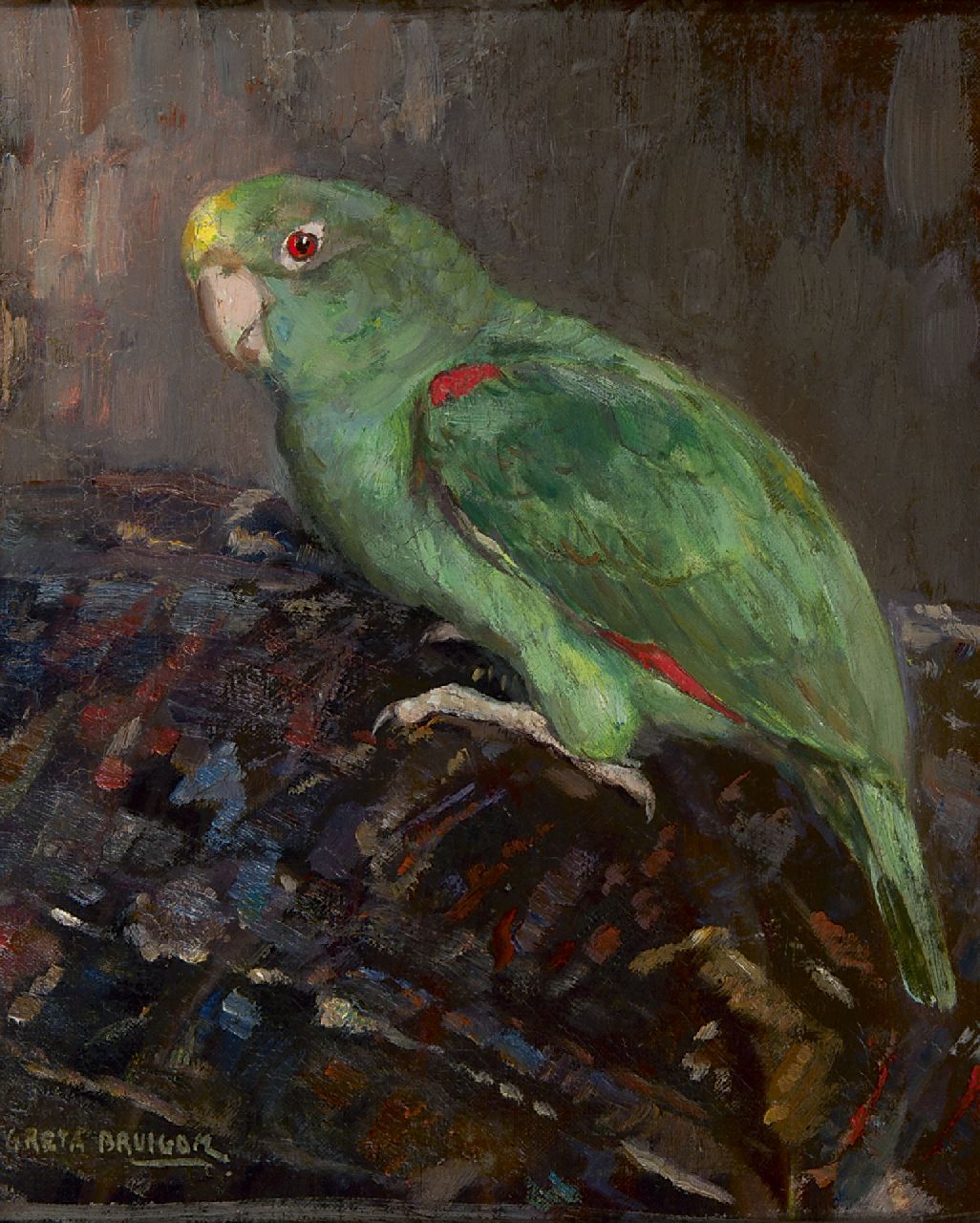 Greta Bruigom war in den 1930er Jahren eine geliebte und bewunderte Tiermalerin. Sie malte Vögel, Reptilien, Affen, Mäuse, Eidechsen und Reisvögel mit Liebe und Aufmerksamkeit für ihren Charakter. Darüber hinaus machte der Maler Stillleben. In ihren Fächern trat Greta Bruigom in die Fußstapfen ihrer Lehrerin, des Tiermalers Cornelis Jan Mension, der ebenfalls in Delft lebte und arbeitete. Die Künstlerin stellte in Den Haag, Rotterdam und Delft aus und starb bereits in jungen Jahren, wodurch ihr Oeuvre klein blieb.
