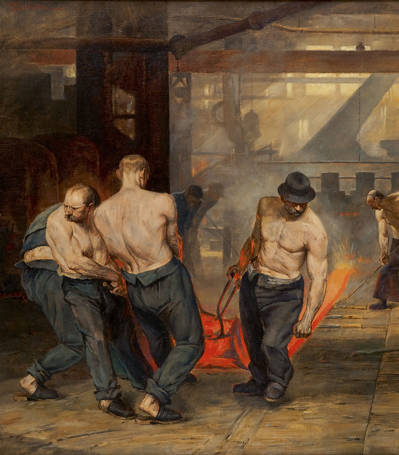 H.V. v.d. Porten Kunstwerk • Gemälde • zuvor zu verkaufen Labourers in a steel-rolling mill