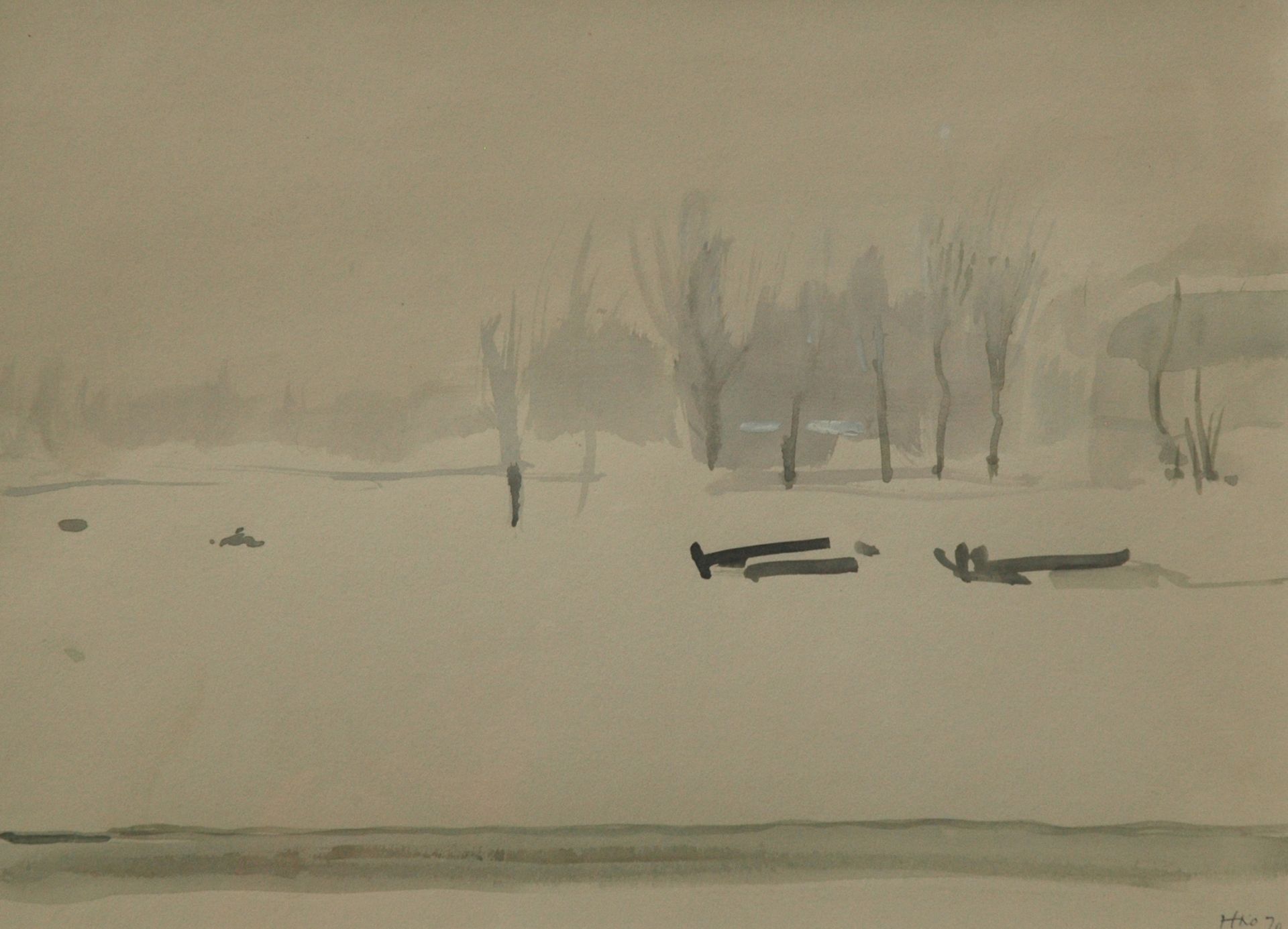 Harm Kamerlingh Onnes Kunstwerk • Aquarell • Zeichnung • zuvor zu verkaufen Winter in a public garden