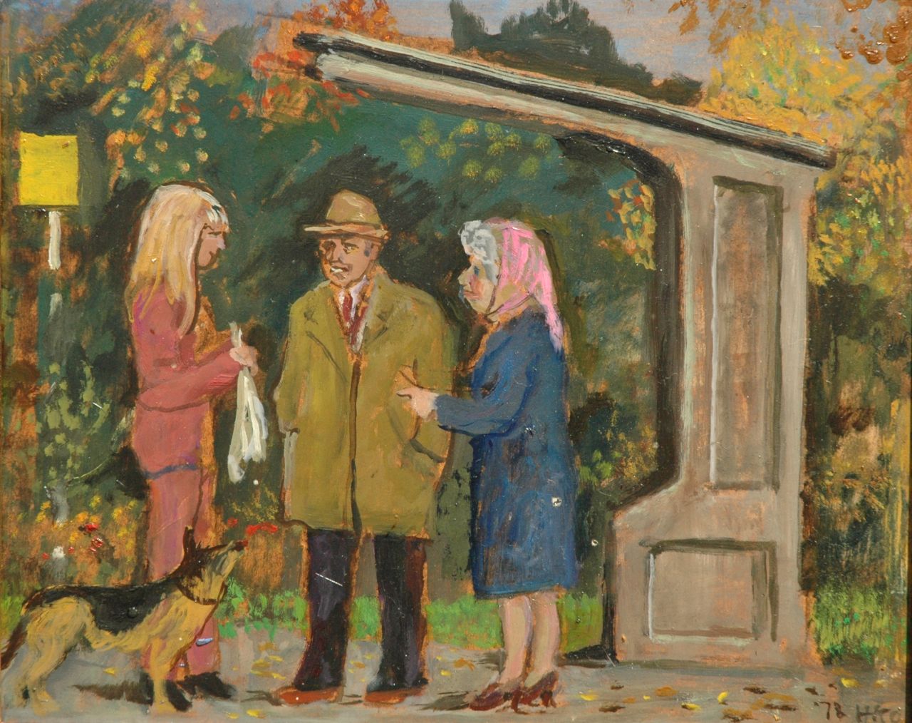 Kamerlingh Onnes H.H.  | 'Harm' Henrick Kamerlingh Onnes, A talk at the busstop, Öl auf Holzfaser 27,2 x 33,5 cm, signed l.r. with monogram und dated '78