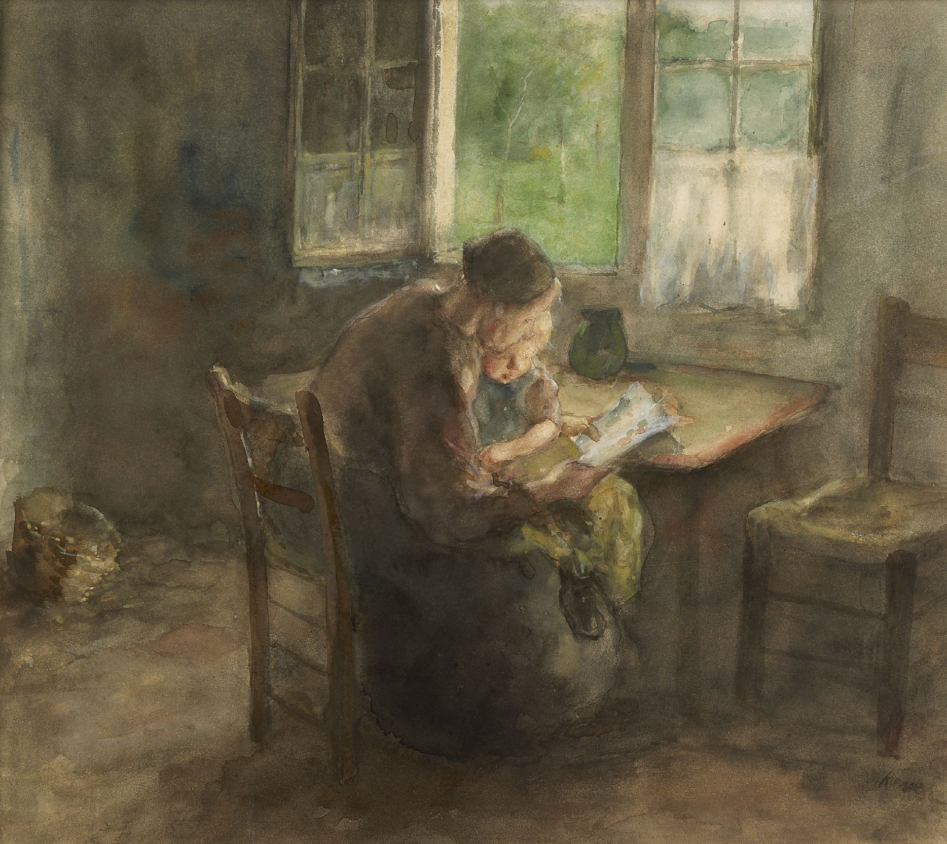 Jacob Simon Hendrik Kever gehört zu den bekanntesten Malern der Larense School. Er wurde in Amsterdam geboren, zeigte schon sehr jung sein Talent und bekam über Isaac Israels eine Lehrstelle im Atelier von P.F.Greive.Nach dessen Verscheiden 1878 liess Kever sich im Gooi nieder, zunächst in Blaricum und nachher in Laren, wo er Ratschläge und Hinweise bekam von Anton Mauve. Im Winter hatte er dann eine Werkstatt in Amsterdam. Kever war namentlich bekannt durch seine in lockeren Pinselstrichen und harmonierenden Farben gemalten Innenräume mit Figuren, Bauern und Kindern. Man bewunderte darin die Atmosphäre. den Lichteinfall und die Farben, so wie das besondere Grün vom Gras.