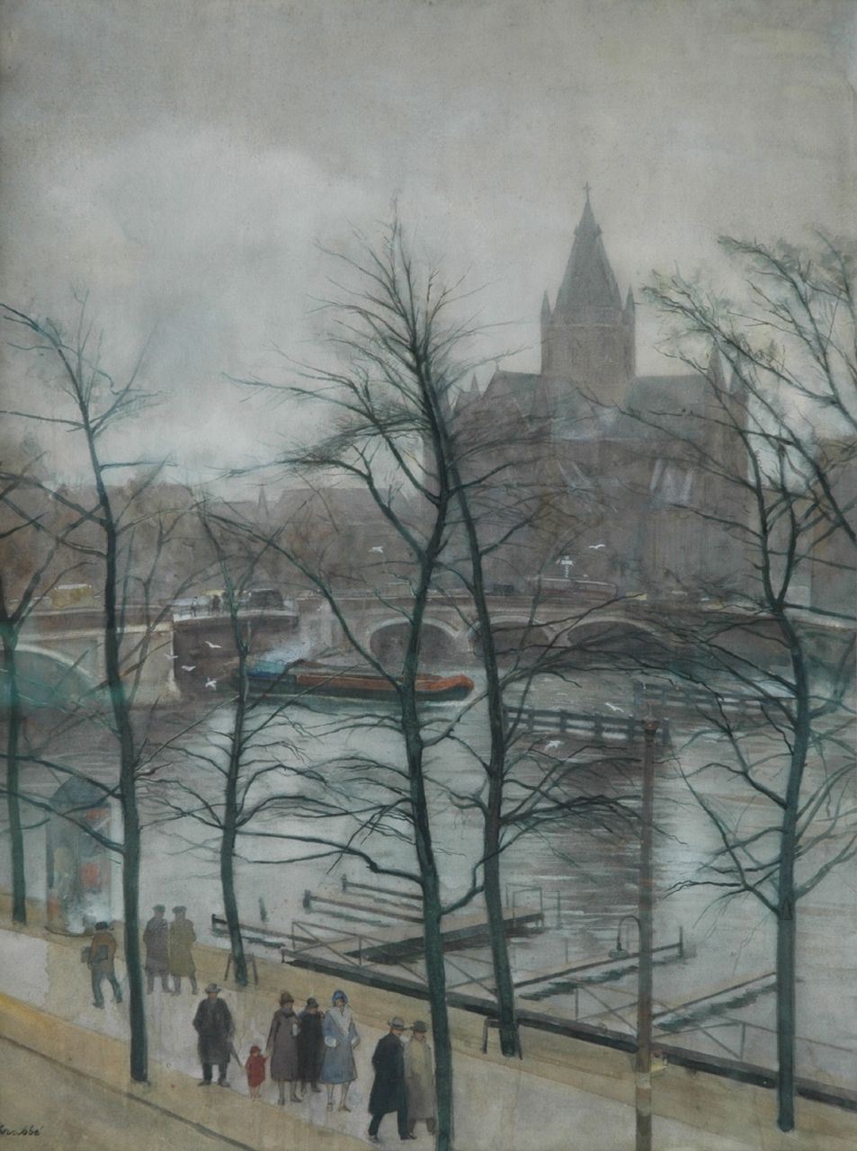 Heinrich Martin Krabbé Kunstwerk • Aquarell • Zeichnung • zuvor zu verkaufen View of the Amstel, with the St. Willibrord beyond, Amsterdam