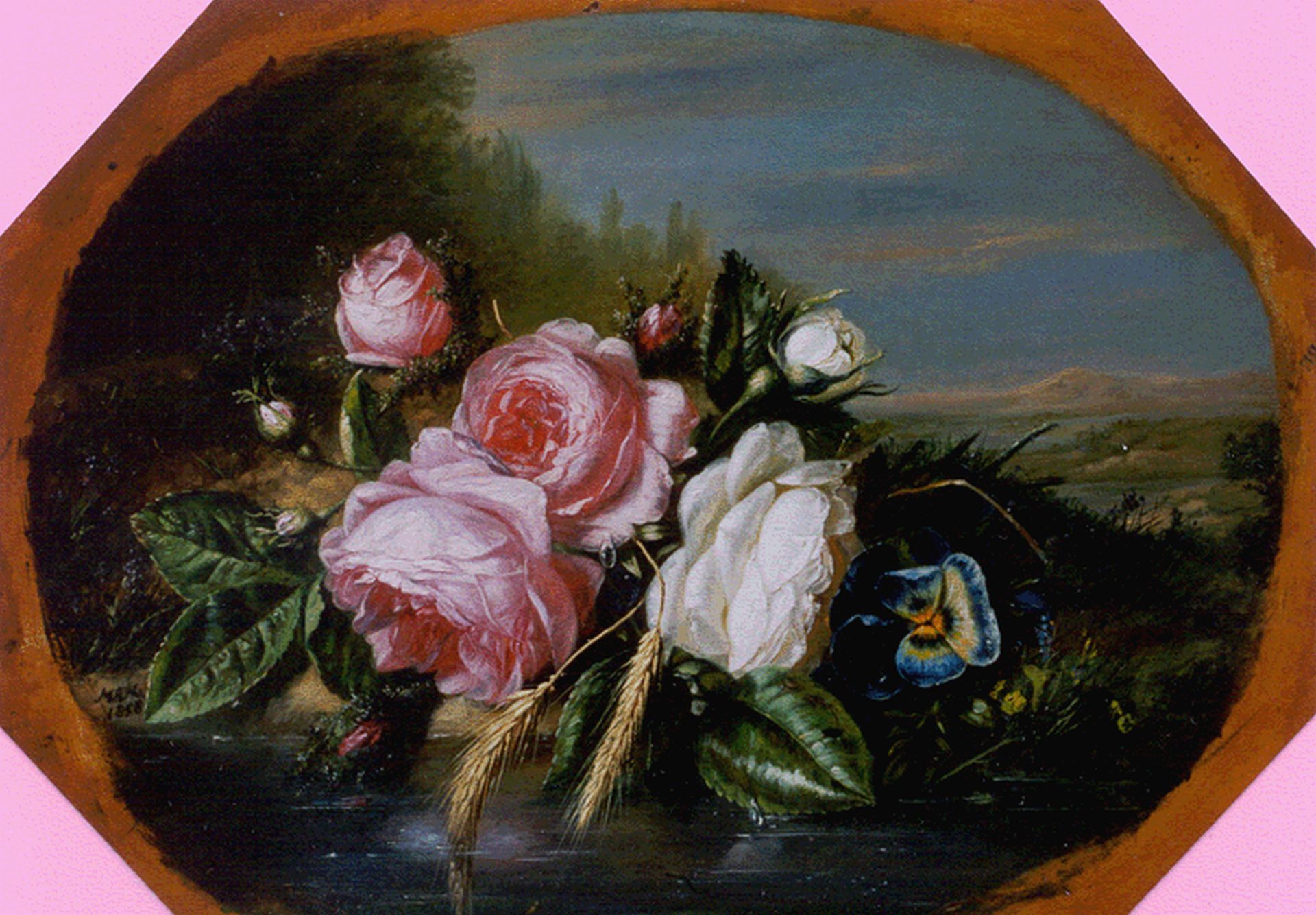 Hamburger H.A.  | Helen Augusta 'Hélène' Hamburger, A Still Life with Roses, Öl auf Holz 29,4 x 40,0 cm, signed with the initials l.m. und dated 1858