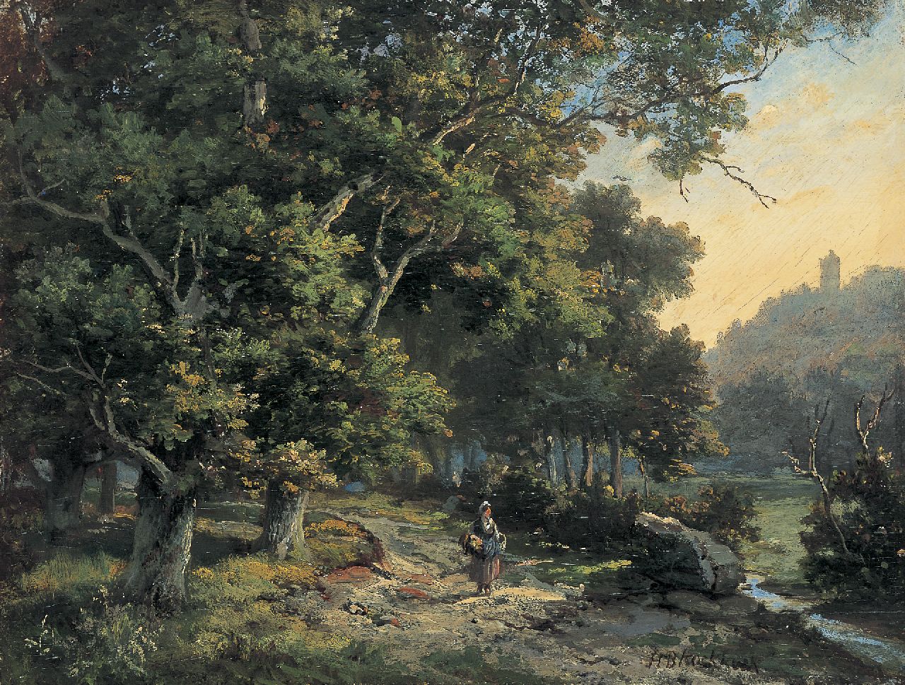 Hendrik Barend Koekkoek Kunstwerk • Gemälde • zuvor zu verkaufen Auf einem Weg am Waldrand entlang