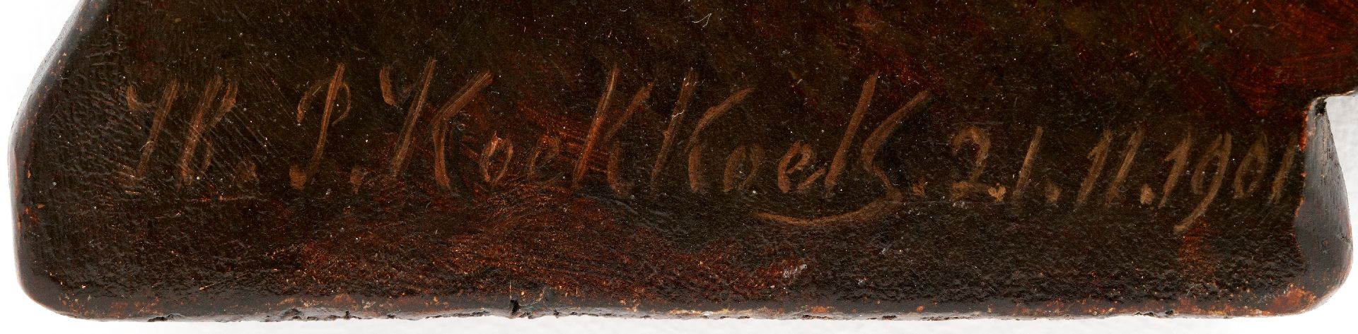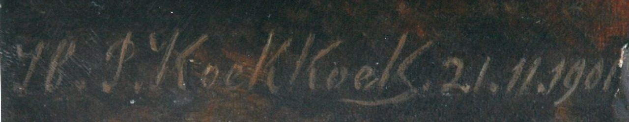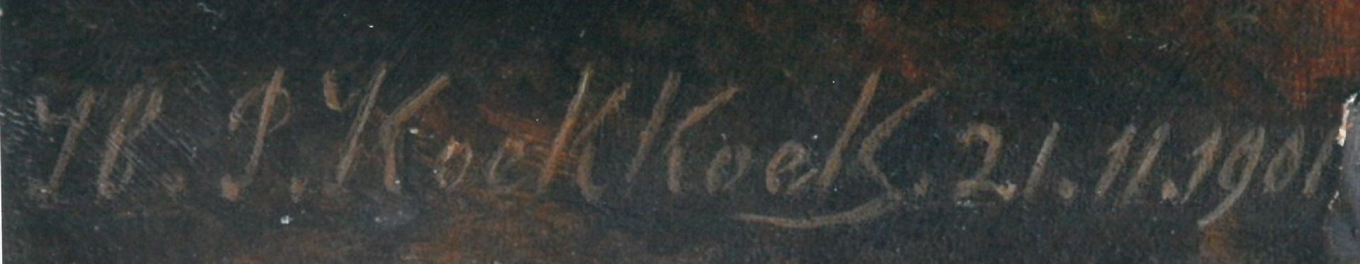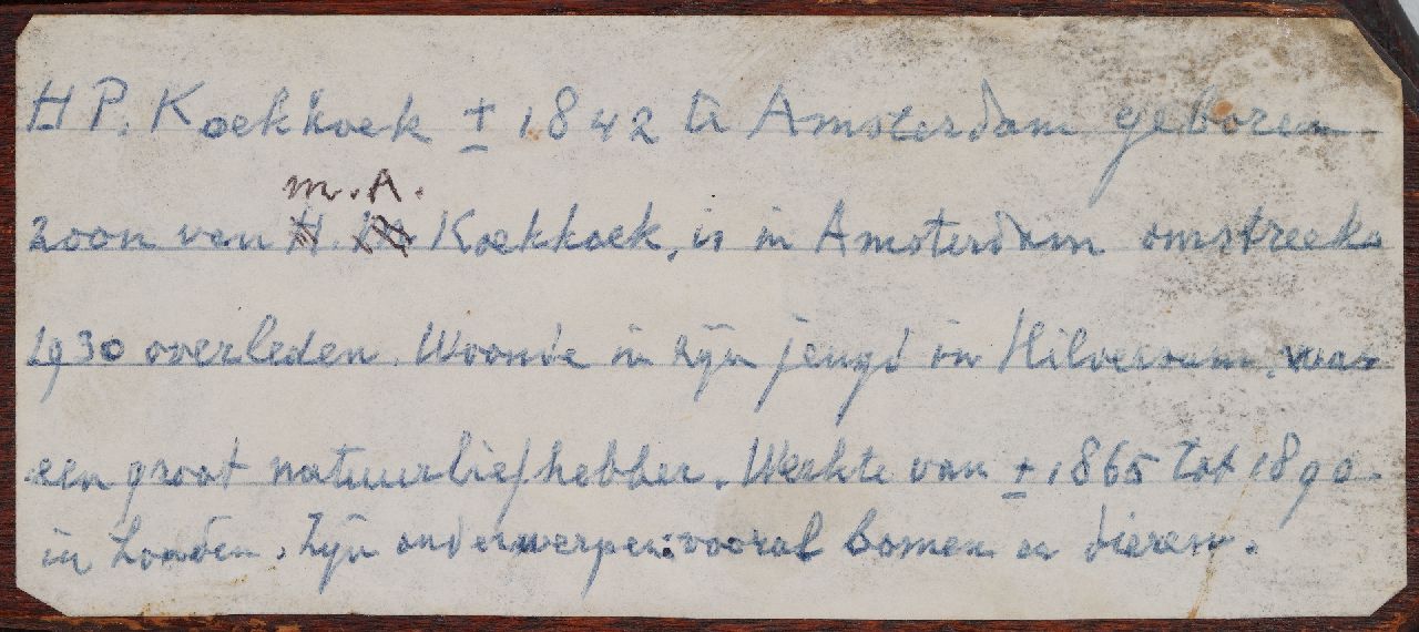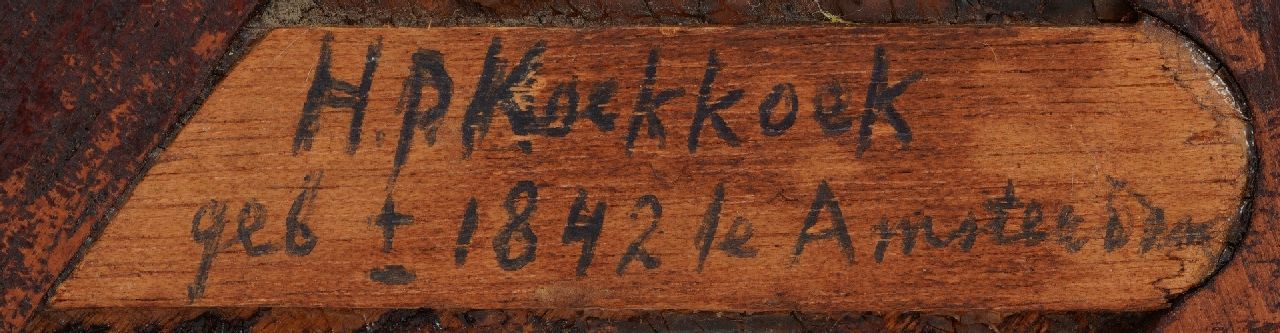 Pieter Hendrik Koekkoek war der Sohn des Landschaftsmalers M.A. Koekkoek und gehörte zur dritten Generation Koekkoekmaler. De Einfluss seines Vaters ist deutlich sichtbar in seinen glänzenden romantischen Landschaften mit imponierenden Baumgruppen, nichtigen Figuren und Vieh. Er lebte in Amsterdam und auch einige Zeit (um 1865-1890) in London, wo sein Vetter Hermanus jr eine Kunsthandlung innehatte. Pieter Hendrik soll ein grosser Naturliebhaber gewesen sein und signierte seine Gemälde in der Regel mit H.P. Koekkoek.