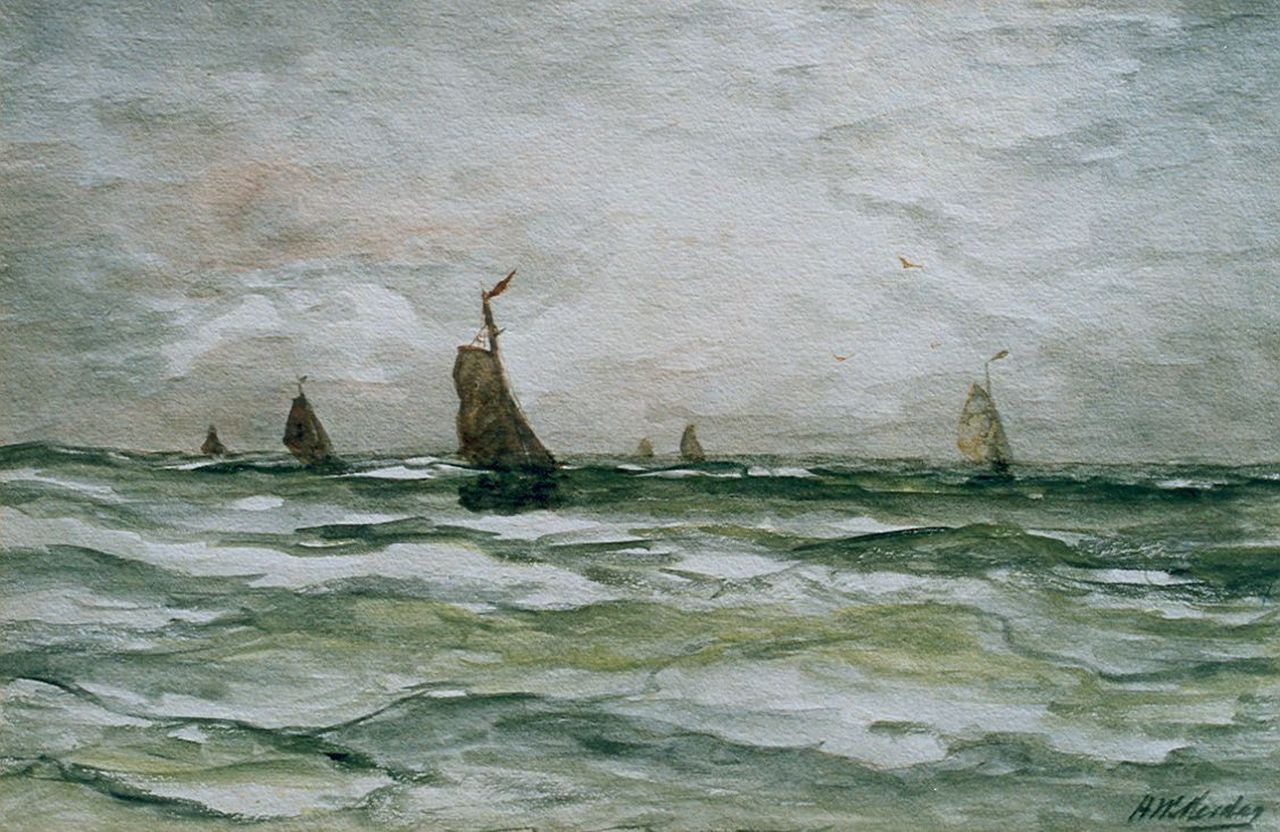 H.W. Mesdag war der Marinemaler der Haagse School. Im relativ hohen Alterwählte entschied er sich für die Malerei. Nach einem Aufenthalt in Oosterbeek und Brüssel liess er sich 1869 im Haag nieder, wo ihn das Strand, das Meer und das Leben der Scheveninger Fischer sofort fesselte. In einer schnellen, lockeren Pinselführung und in zahllosen Variationen von braunen, goldenen und grauen Tönen brachte er diese Motive auf die Leinwand. Mesdag hatte eine grosse Produktion, als wolle er alle verlorene Zeit nachholen. Sein Werk war in Frankreich sehr geliebt und wurde öfters im ‘Salon’ in Paris mit einem Preis augezeichnet.