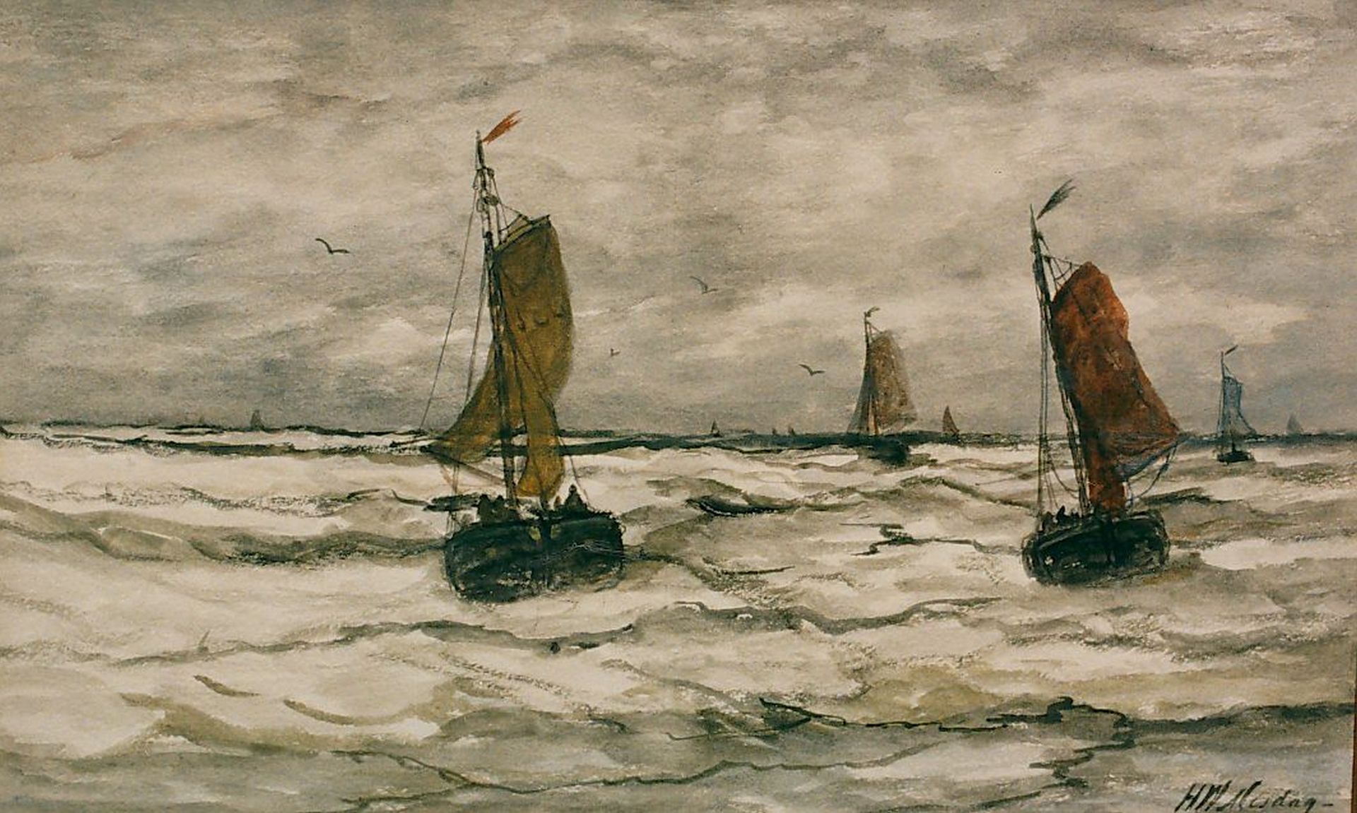 H.W. Mesdag war der Marinemaler der Haagse School. Im relativ hohen Alterwählte entschied er sich für die Malerei. Nach einem Aufenthalt in Oosterbeek und Brüssel liess er sich 1869 im Haag nieder, wo ihn das Strand, das Meer und das Leben der Scheveninger Fischer sofort fesselte. In einer schnellen, lockeren Pinselführung und in zahllosen Variationen von braunen, goldenen und grauen Tönen brachte er diese Motive auf die Leinwand. Mesdag hatte eine grosse Produktion, als wolle er alle verlorene Zeit nachholen. Sein Werk war in Frankreich sehr geliebt und wurde öfters im ‘Salon’ in Paris mit einem Preis augezeichnet.